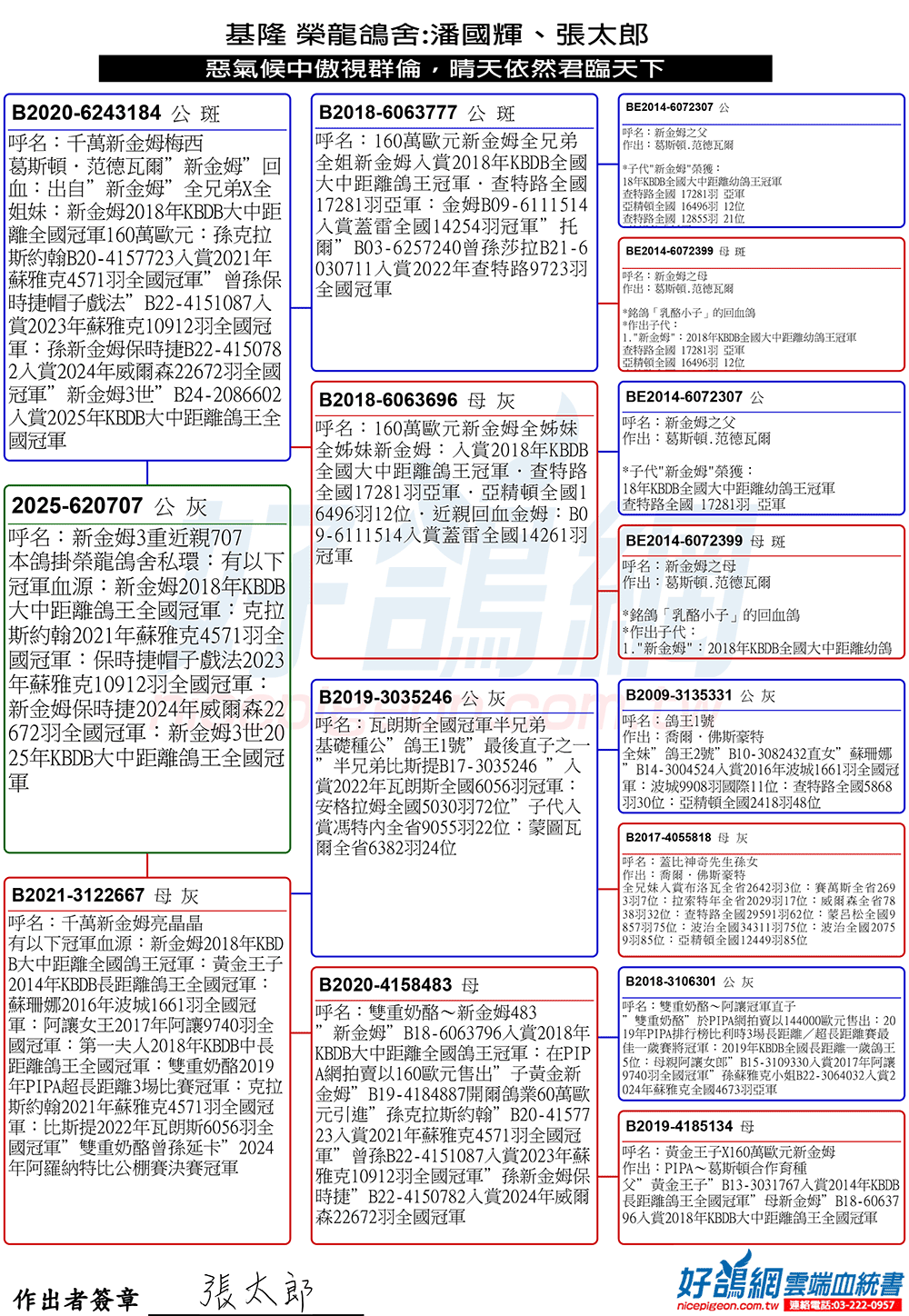 據了解,榮龍鴿舍現役育種主力,包括三重信義秋季五關綜合冠軍,國光船隊全船總冠軍,汐止成強秋季綜合冠軍,大新泰春季綜合冠軍之外,近期更是導入多羽戰功彪炳的實戰綜合冠軍直子女,包括大北區春季13630羽殘66羽五關綜合冠軍,北海船隊全船總冠軍直女,嘉義民雄第一支會冬季3115羽殘35羽五關綜合冠軍,全船總冠軍直女,雙北聯盟夏季3456羽殘3羽伯馬四關綜合冠軍,大草屯冬季11317羽殘30羽五關綜合冠軍直子女,竹南大新冬季2677羽殘3羽伯馬六關綜合冠軍直女,南臺灣夏季七關綜合冠軍直女,彰化大埔塩冬季6338羽殘30羽五關綜合冠軍直女。