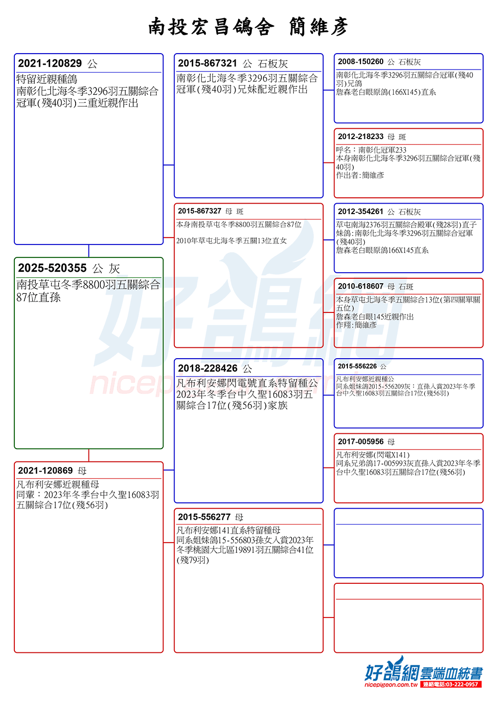 宏昌鴿舍自1978年起便積極引進國際優質血系,包括卡多利斯、詹森老白眼、摩利斯戈登、勢山細川、修斯肯與凡布利安娜等世界級名血。惡氣候歸返為主的血統。