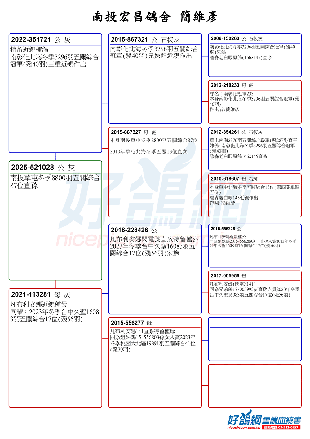 宏昌鴿舍自1978年起便積極引進國際優質血系,包括卡多利斯、詹森老白眼、摩利斯戈登、勢山細川、修斯肯與凡布利安娜等世界級名血。惡氣候歸返為主的血統。