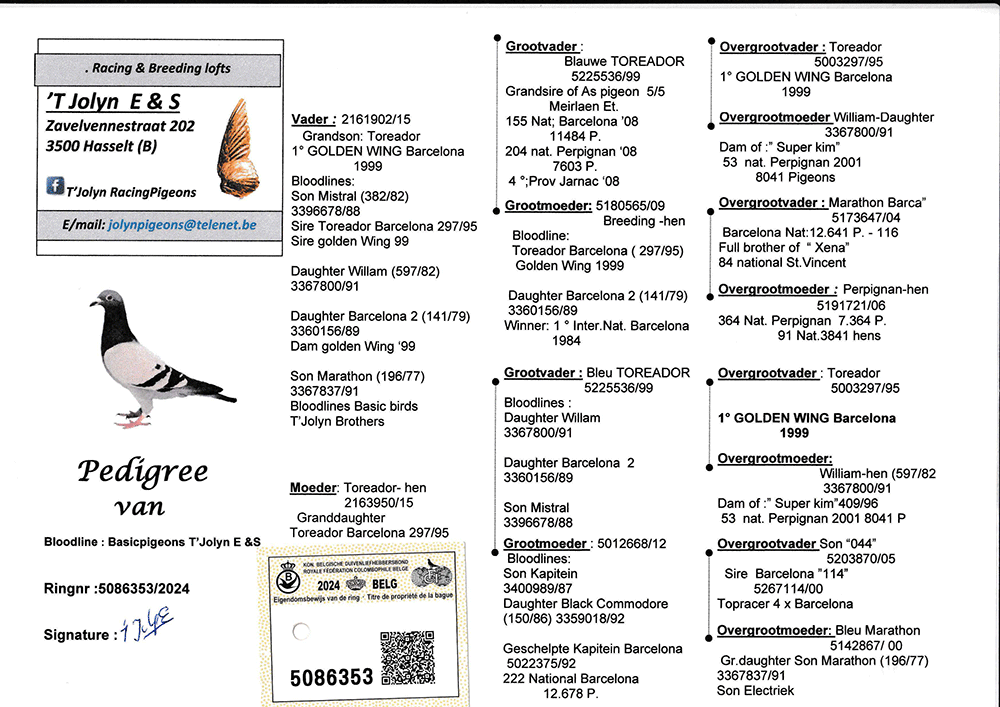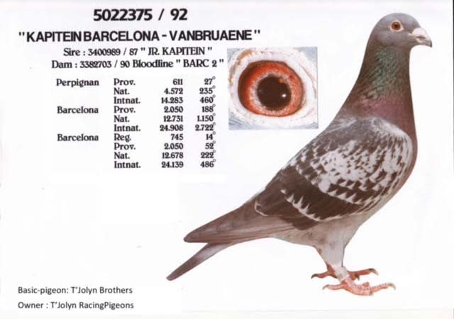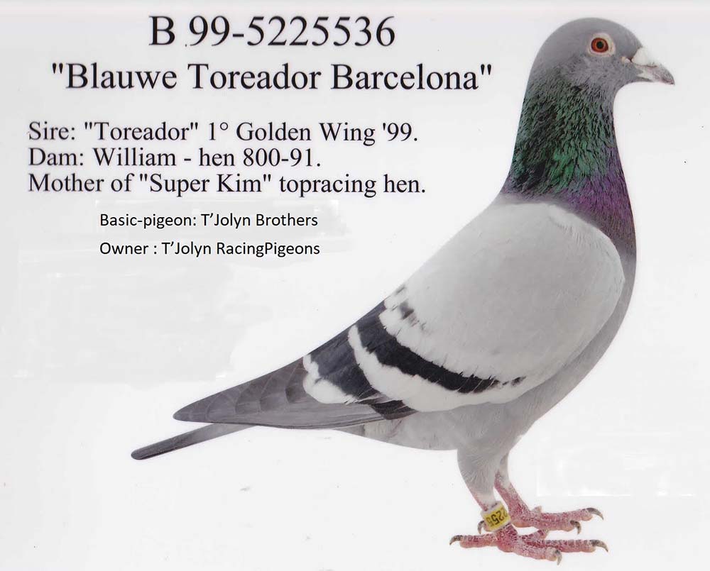比利時裘林兄弟「T'JOLYN-PIGEONS」鴿舍30年來致力於培育最好的100%近親血統。T'Jolyn 鴿舍的基礎種鴿的後代為:「巴塞隆納鬥牛士」、「巴塞隆納桂冠鴿」、「超級金」、「巴塞隆納冠軍」、「馬拉松冠軍」、「未來最好的」等經典的鴿系!