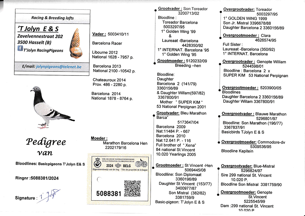 比利時裘林兄弟「T'JOLYN-PIGEONS」鴿舍30年來致力於培育最好的100%近親血統。T'Jolyn 鴿舍的基礎種鴿的後代為:「巴塞隆納鬥牛士」、「巴塞隆納桂冠鴿」、「超級金」、「巴塞隆納冠軍」、「馬拉松冠軍」、「未來最好的」等經典的鴿系!