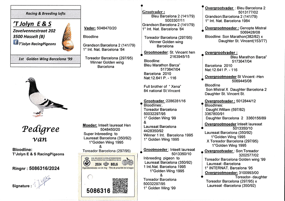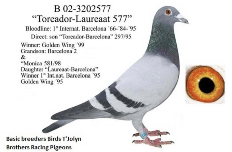 比利時裘林兄弟「T'JOLYN-PIGEONS」鴿舍30年來致力於培育最好的100%近親血統。T'Jolyn 鴿舍的基礎種鴿的後代為:「巴塞隆納鬥牛士」、「巴塞隆納桂冠鴿」、「超級金」、「巴塞隆納冠軍」、「馬拉松冠軍」、「未來最好的」等經典的鴿系!