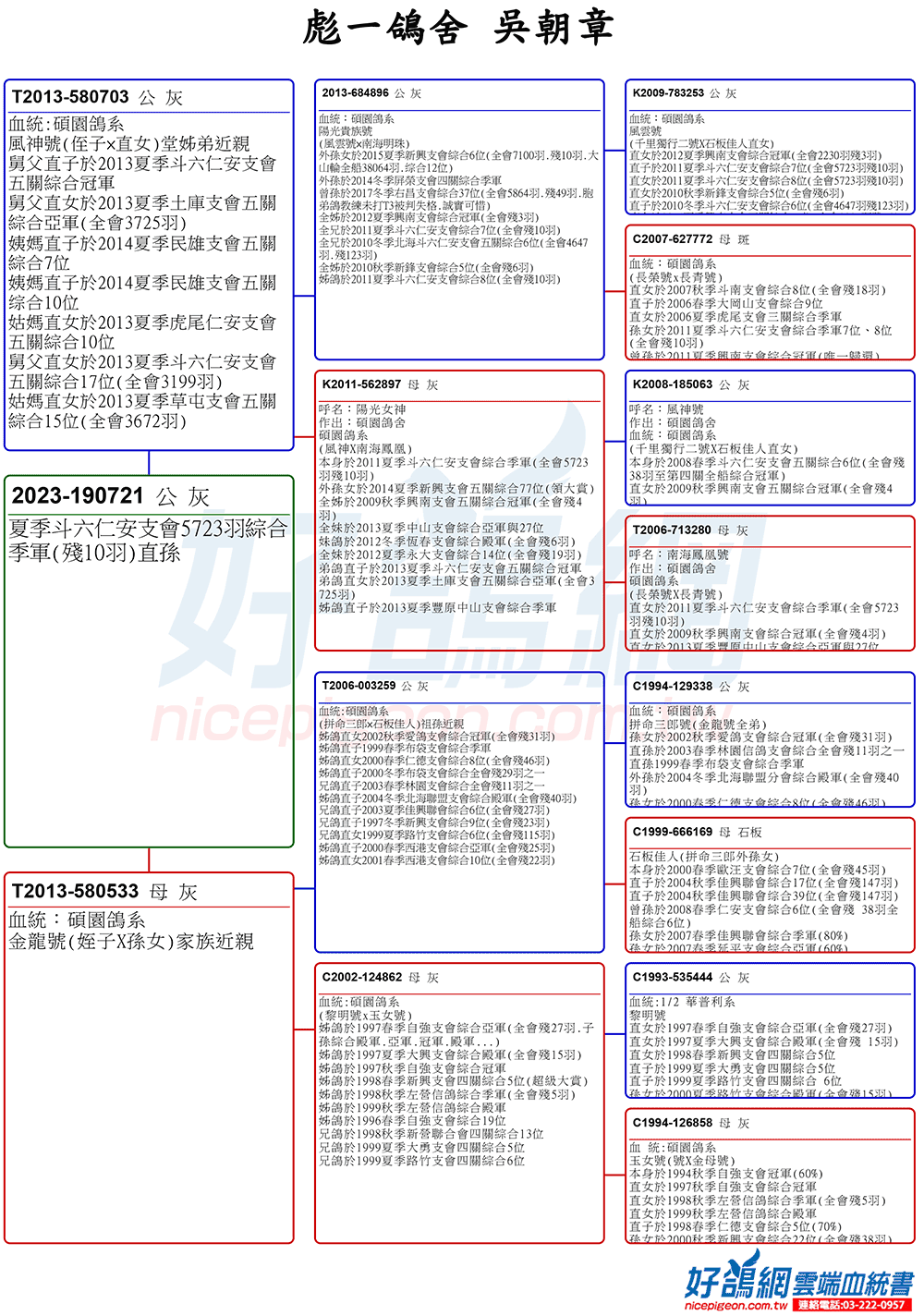 另外,吳朝章鴿舍的主力血脈四號西翁及凡布利安娜是鴿舍的基石。吳董分享四號西翁是早年從天一鴿舍鄭金城前輩處導入光明希望直系,這一路的西翁系對於擅長惡劣氣候飛行的獨到之處,成績斐然,所以這一路西翁系存留至今。