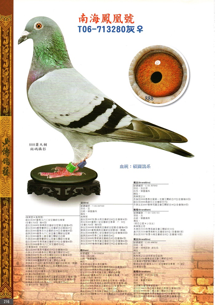 據了解,吳朝章多年前也引入海翔名家許庭碩(許明純)的白花鴿系,眾所皆知許董鴿系成績優異,許多名家名舍都有出現碩園鴿舍-許庭碩鴿系的身影。所以吳朝章也大手筆引進許多羽高代的白花家族增加戰力。例如白色太陽(春季社皮七關綜合冠軍殘四羽、延聯輪殘25羽全船總冠軍)、玉興號(夏季西線五關殘10羽綜合冠軍,全船總合7位)、金龍號近親家族等勇猛悍將。在2023年艱困的冬季賽,榮獲北海金溪湖12066羽四關綜合亞軍(殘74羽)、三關綜合75位(殘97羽)就是一個明證。
