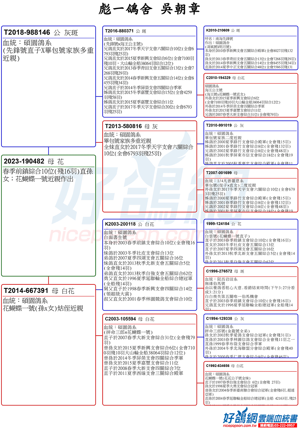 據了解,吳朝章多年前也引入海翔名家許庭碩(許明純)的白花鴿系,眾所皆知許董鴿系成績優異,許多名家名舍都有出現碩園鴿舍-許庭碩鴿系的身影。所以吳朝章也大手筆引進許多羽高代的白花家族增加戰力。例如白色太陽(春季社皮七關綜合冠軍殘四羽、延聯輪殘25羽全船總冠軍)、玉興號(夏季西線五關殘10羽綜合冠軍,全船總合7位)、金龍號近親家族等勇猛悍將。在2023年艱困的冬季賽,榮獲北海金溪湖12066羽四關綜合亞軍(殘74羽)、三關綜合75位(殘97羽)就是一個明證。