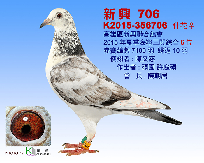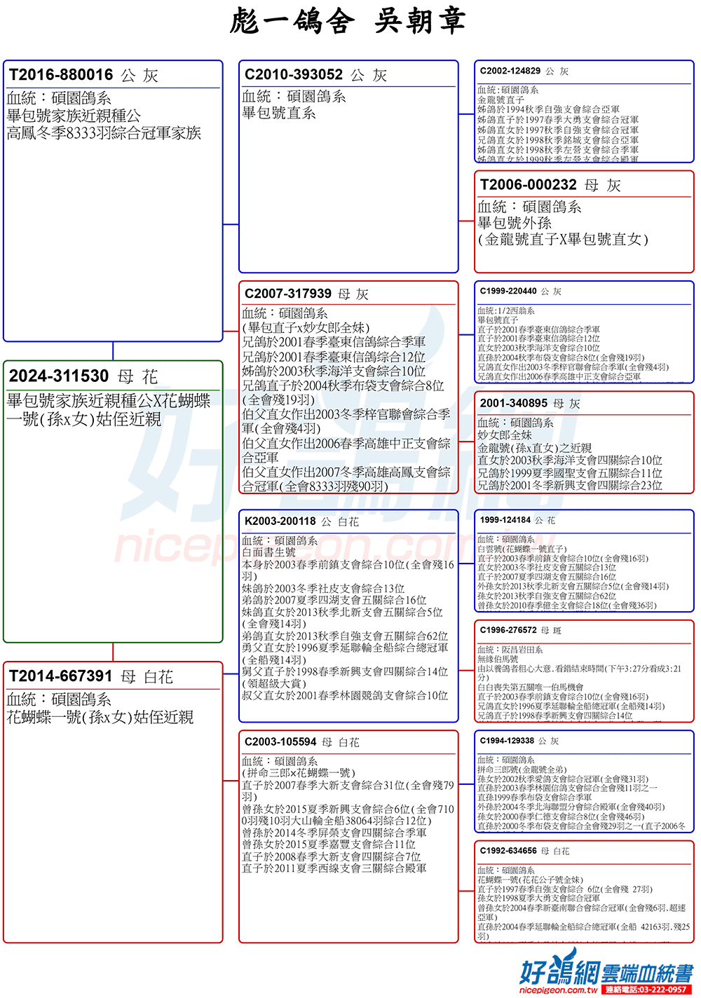 據了解,吳朝章多年前也引入海翔名家許庭碩(許明純)的白花鴿系,眾所皆知許董鴿系成績優異,許多名家名舍都有出現碩園鴿舍-許庭碩鴿系的身影。所以吳朝章也大手筆引進許多羽高代的白花家族增加戰力。例如白色太陽(春季社皮七關綜合冠軍殘四羽、延聯輪殘25羽全船總冠軍)、玉興號(夏季西線五關殘10羽綜合冠軍,全船總合7位)、金龍號近親家族等勇猛悍將。在2023年艱困的冬季賽,榮獲北海金溪湖12066羽四關綜合亞軍(殘74羽)、三關綜合75位(殘97羽)就是一個明證。