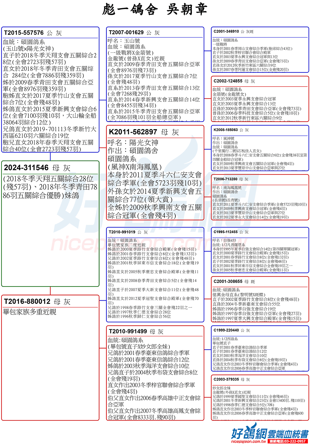 據了解,吳朝章多年前也引入海翔名家許庭碩(許明純)的白花鴿系,眾所皆知許董鴿系成績優異,許多名家名舍都有出現碩園鴿舍-許庭碩鴿系的身影。所以吳朝章也大手筆引進許多羽高代的白花家族增加戰力。例如白色太陽(春季社皮七關綜合冠軍殘四羽、延聯輪殘25羽全船總冠軍)、玉興號(夏季西線五關殘10羽綜合冠軍,全船總合7位)、金龍號近親家族等勇猛悍將。在2023年艱困的冬季賽,榮獲北海金溪湖12066羽四關綜合亞軍(殘74羽)、三關綜合75位(殘97羽)就是一個明證。