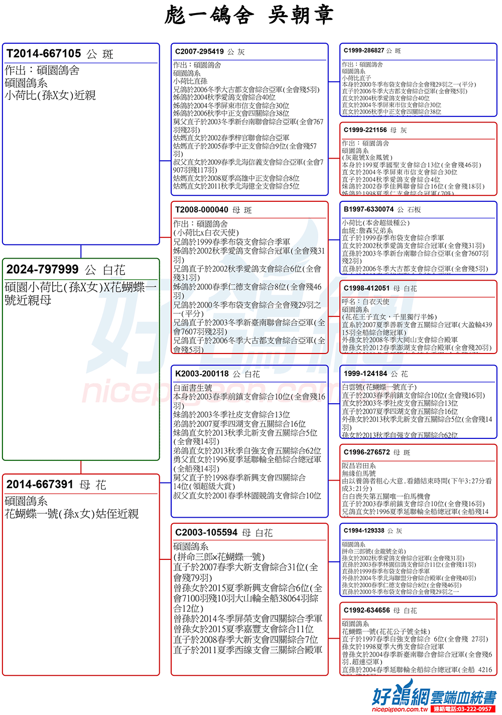 據了解,吳朝章多年前也引入海翔名家許庭碩(許明純)的白花鴿系,眾所皆知許董鴿系成績優異,許多名家名舍都有出現碩園鴿舍-許庭碩鴿系的身影。所以吳朝章也大手筆引進許多羽高代的白花家族增加戰力。例如白色太陽(春季社皮七關綜合冠軍殘四羽、延聯輪殘25羽全船總冠軍)、玉興號(夏季西線五關殘10羽綜合冠軍,全船總合7位)、金龍號近親家族等勇猛悍將。在2023年艱困的冬季賽,榮獲北海金溪湖12066羽四關綜合亞軍(殘74羽)、三關綜合75位(殘97羽)就是一個明證。