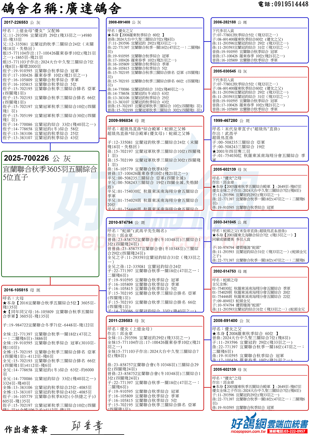 ▲母鴿:16-105815秋季宜蘭聯合五關綜合5位