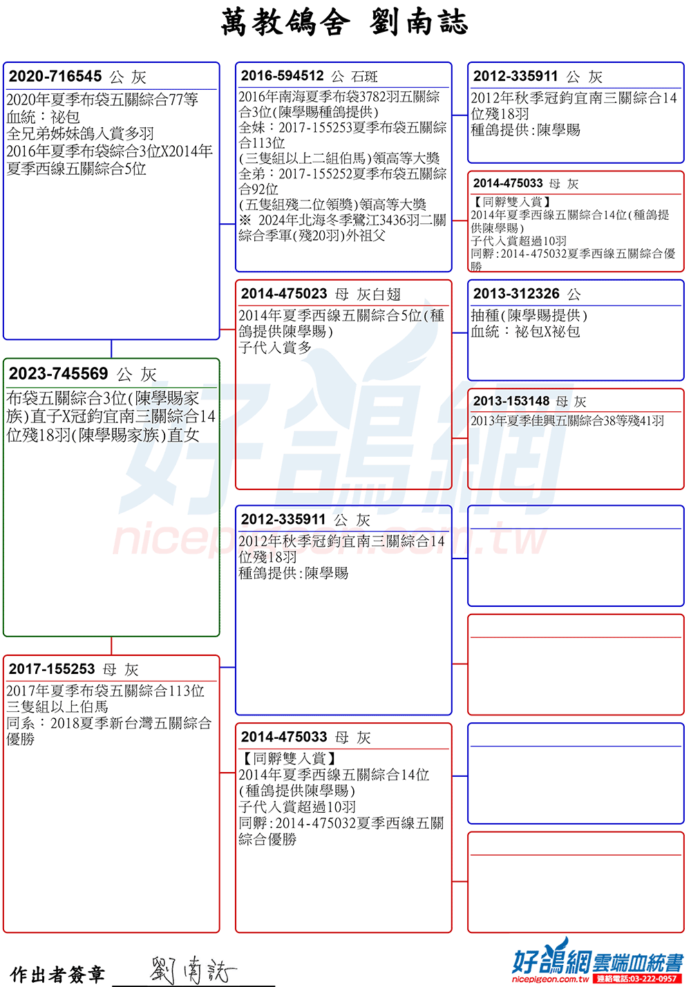 詹森019高代多重近親;重要種鴿620(子X女)特留