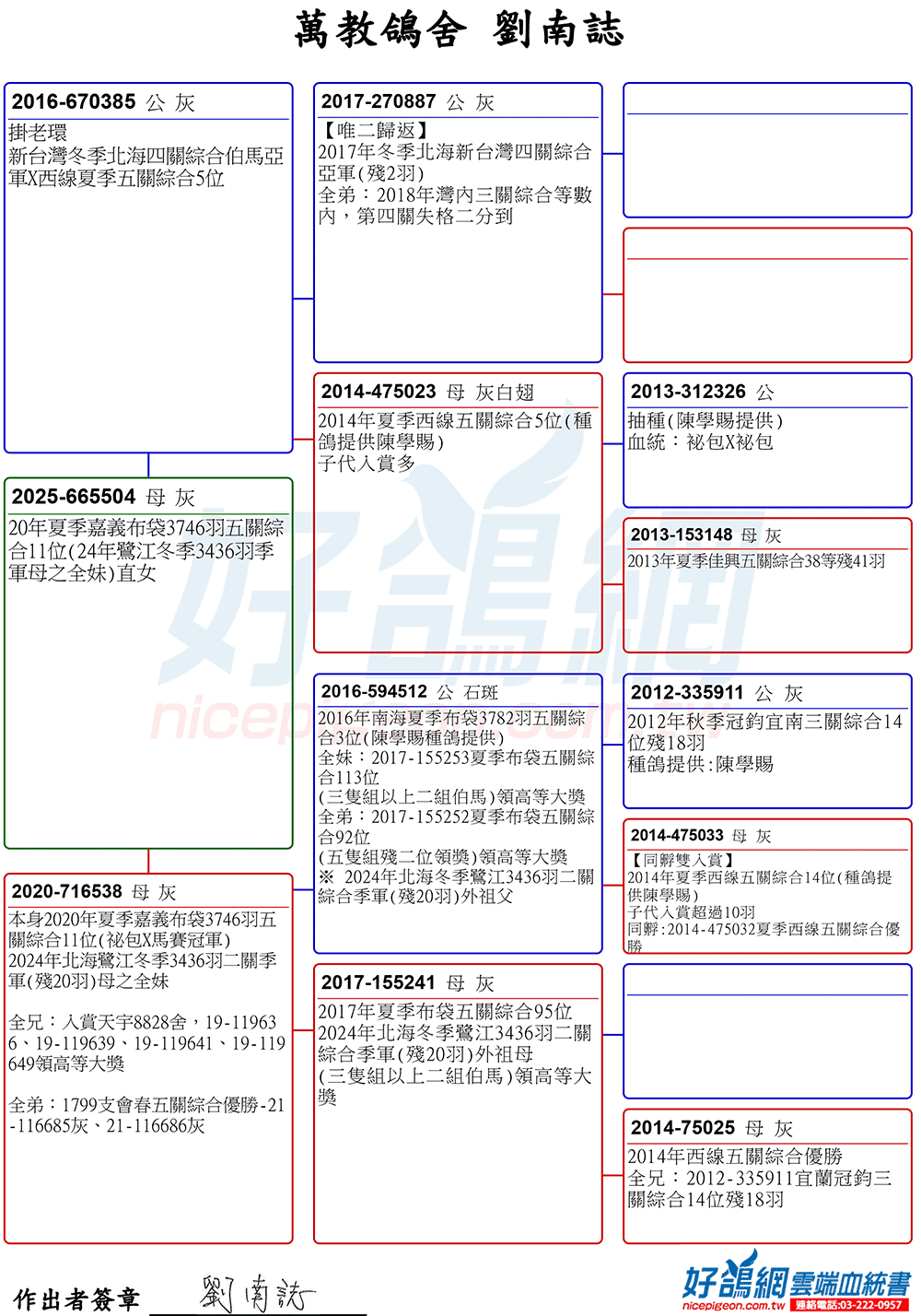 台南學甲的劉南誌是秘包系名家,家中映入眼簾的多不可數的入賞鴿照,更引人注意的是,入賞鴿照幾乎都是以灰鴿系為主,也表示秘包優秀血緣強勢的遺傳基因讓萬教鴿舍-劉南誌的整體水準一致,可見多年來嚴謹的配對與持續穩定的入賞成績,都是日積月累的經驗所換來的甜蜜果實。
