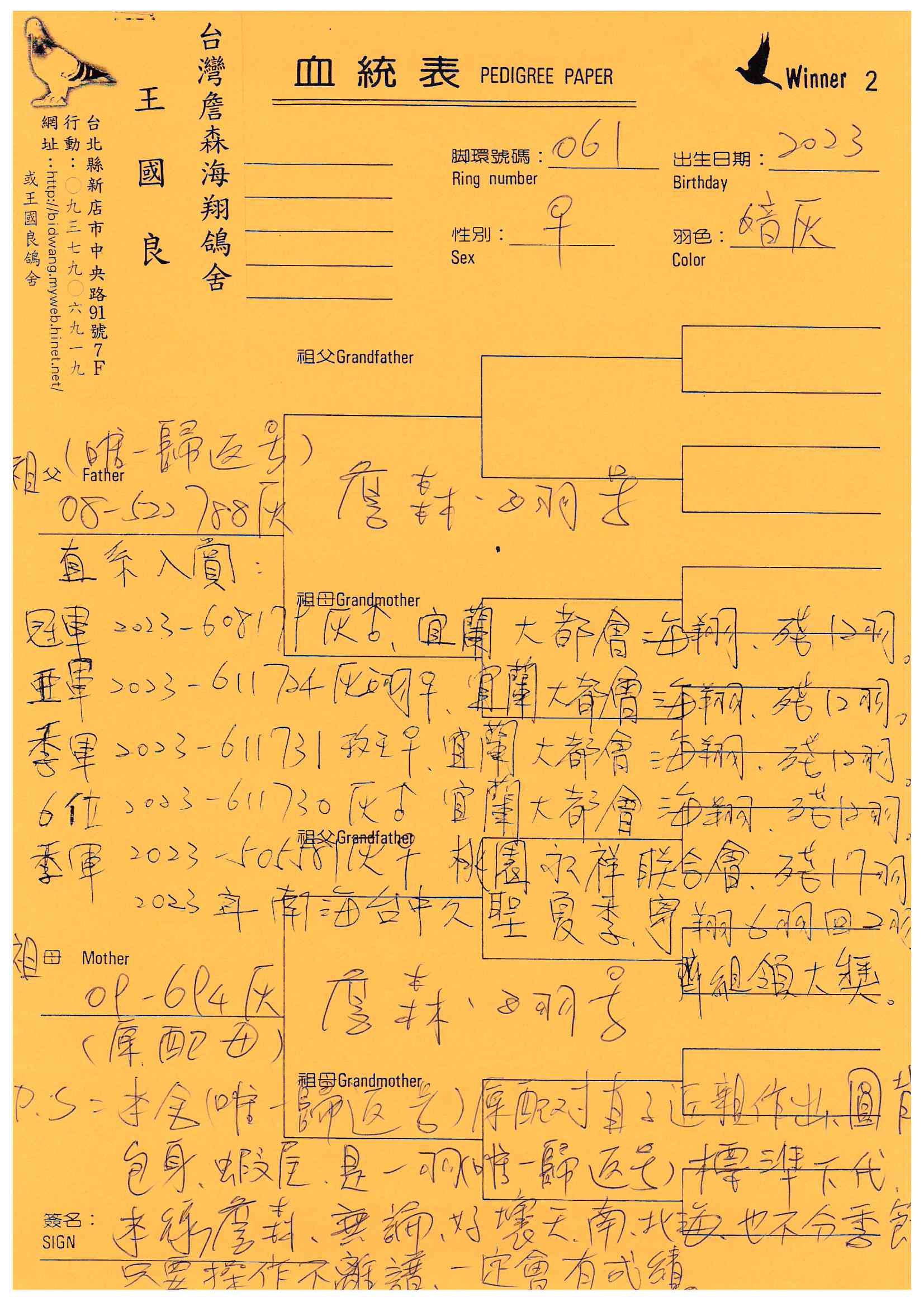 以飼養四季都能入賞詹森系聞名的新店王國良,舍內種鴿皆是詹森家族相互作育而成,能保有詹森系統的特色與優勢。從本身作出參賽和絡繹不絕種鴿提供資訊等各式入賞鴿照,得以知曉王國良的詹森家族威名絕非虛構。近年來王國良年紀漸長,開始減少參賽僅以少數寄翔興趣為主,愛鴿心切的他,期望能讓四季都能入賞的詹森家族在各地發光發熱,所以特別將舍內作育的一線主力高代種鴿分享,透過多年來豐富的參賽與作育經驗,讓惡氣候歸返聞名的詹森家族優良血脈,傳承各地賽場開枝散葉,如此一為,也是作為養鴿人多年的肯定吧!