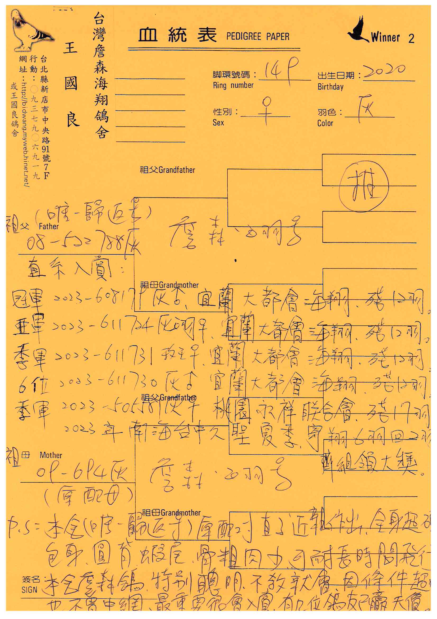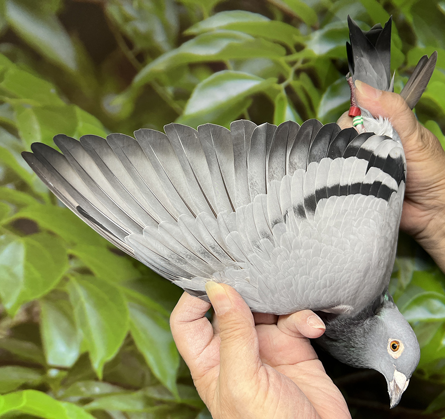 本舍(唯一歸返號)原配對直子近親作出,包身,圓背,蝦尾,骨粗肉少,可耐長時間飛行,本舍詹森鴿,特別聰明,不教就會,因條件超優也不易中網,最重要很會入賞,有幾位鴿友已贏天價。