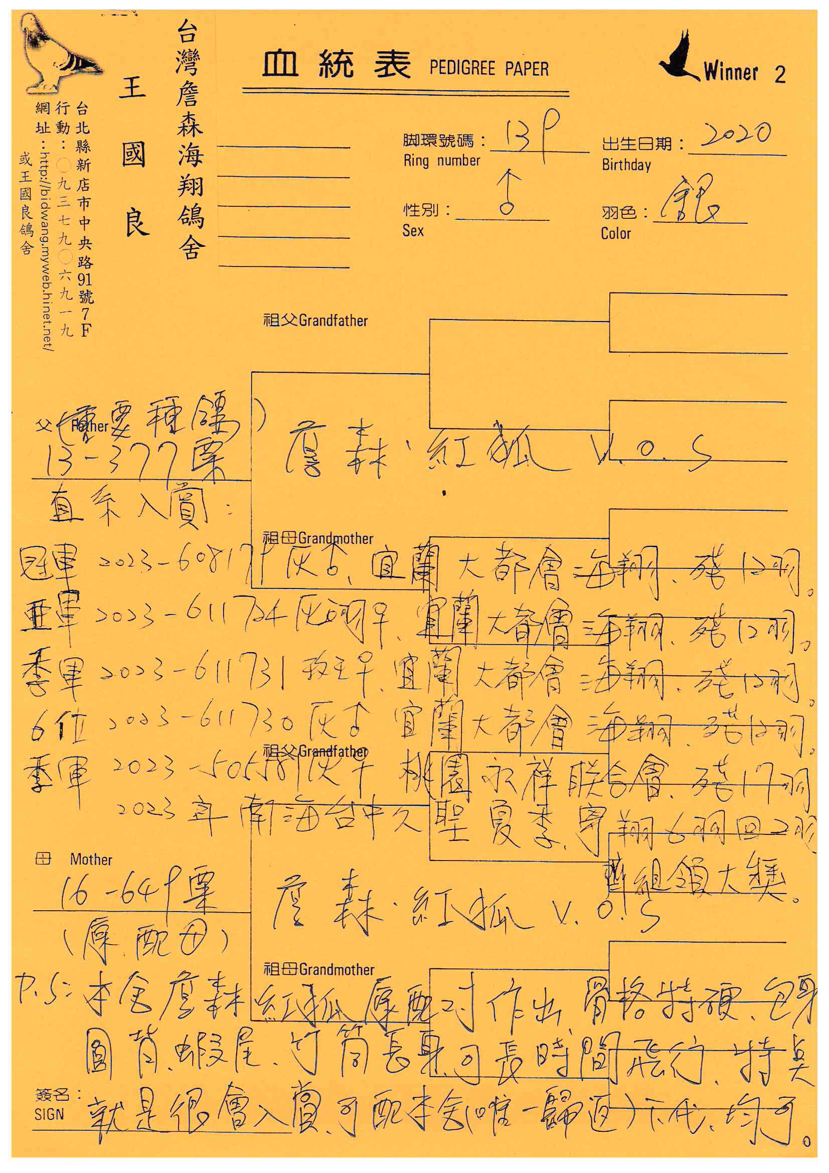 以飼養四季都能入賞詹森系聞名的新店王國良,舍內種鴿皆是詹森家族相互作育而成,能保有詹森系統的特色與優勢。從本身作出參賽和絡繹不絕種鴿提供資訊等各式入賞鴿照,得以知曉王國良的詹森家族威名絕非虛構。近年來王國良年紀漸長,開始減少參賽僅以少數寄翔興趣為主,愛鴿心切的他,期望能讓四季都能入賞的詹森家族在各地發光發熱,所以特別將舍內作育的一線主力高代種鴿分享,透過多年來豐富的參賽與作育經驗,讓惡氣候歸返聞名的詹森家族優良血脈,傳承各地賽場開枝散葉,如此一為,也是作為養鴿人多年的肯定吧!