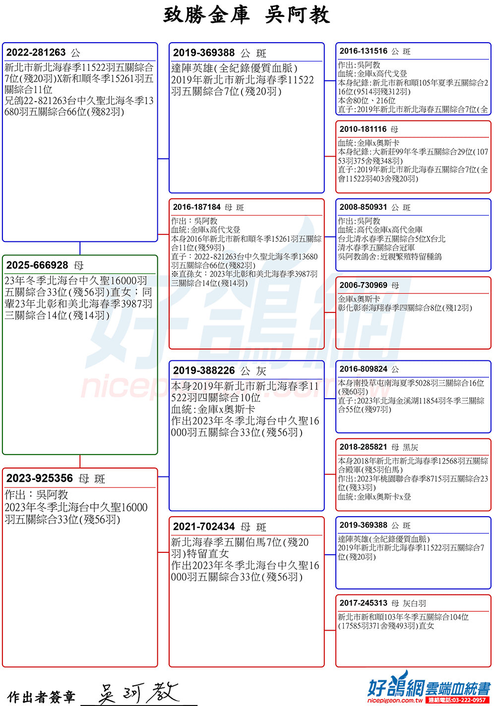 征戰鴿界多年,長久以來都有穩定且持續的入賞紀錄,吳阿教鴿舍內的血系幾乎都是以金庫系為主,輔以戈登系、奧斯卡。多年來吳董親力親為、每日無歇息的照料舍內近親種鴿,對於作出的種鴿型態、特徵都能夠很深入且精準的篩選,精心挑選出來可以參賽也可育種。因此舍內的種鴿幾乎都是以入賞紀錄鴿為主作出的種鴿。
