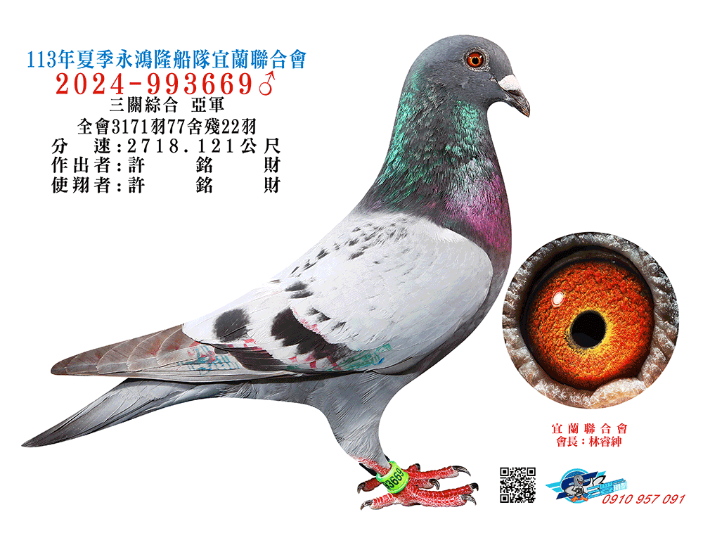 2025年夏季宜蘭聯合會二關綜合8位,環號25-137047灰♂,其父鴿24-993616斑♂,本身入賞夏季三關綜合7位(群益冠軍家族X小火箭三冠家族),母親24-333022,血統為夏季三關綜合亞軍全妹(雙伯馬家族X哈利近親)所作出,許銘財又一次以實戰成績印證了優質血統一脈相承的可貴。