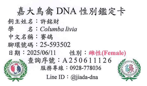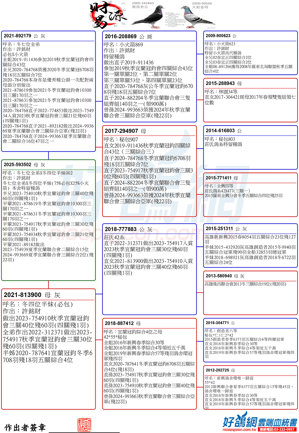 2025年夏季宜蘭聯合會二關綜合8位,環號25-137047灰♂,其父鴿24-993616斑♂,本身入賞夏季三關綜合7位(群益冠軍家族X小火箭三冠家族),母親24-333022,血統為夏季三關綜合亞軍全妹(雙伯馬家族X哈利近親)所作出,許銘財又一次以實戰成績印證了優質血統一脈相承的可貴。
