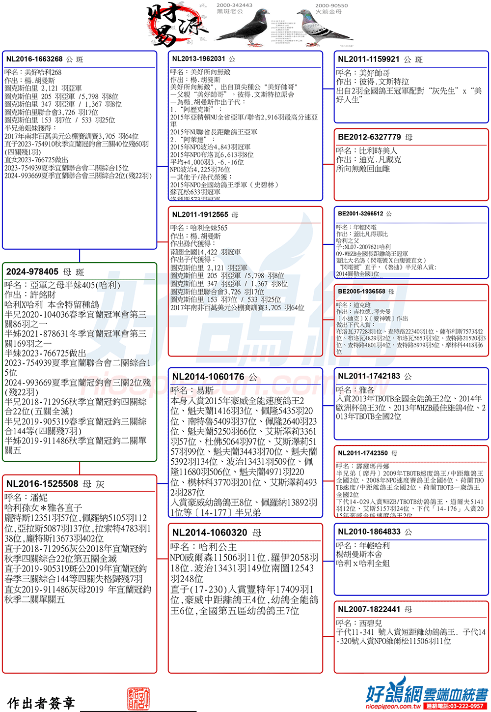 楊.胡曼斯作出美好哈利(圖克斯伯里2121羽亞軍)直女;兄20年春季宜蘭第三關86羽之一、姊21年冬季宜蘭第三關169羽之一