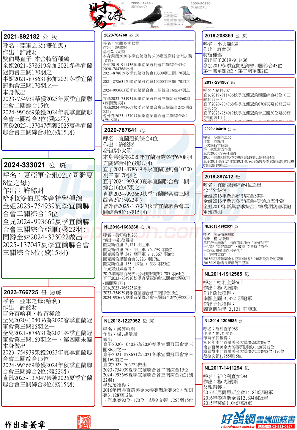 2025年夏季宜蘭聯合會二關綜合8位,環號25-137047灰♂,其父鴿24-993616斑♂,本身入賞夏季三關綜合7位(群益冠軍家族X小火箭三冠家族),母親24-333022,血統為夏季三關綜合亞軍全妹(雙伯馬家族X哈利近親)所作出,許銘財又一次以實戰成績印證了優質血統一脈相承的可貴。