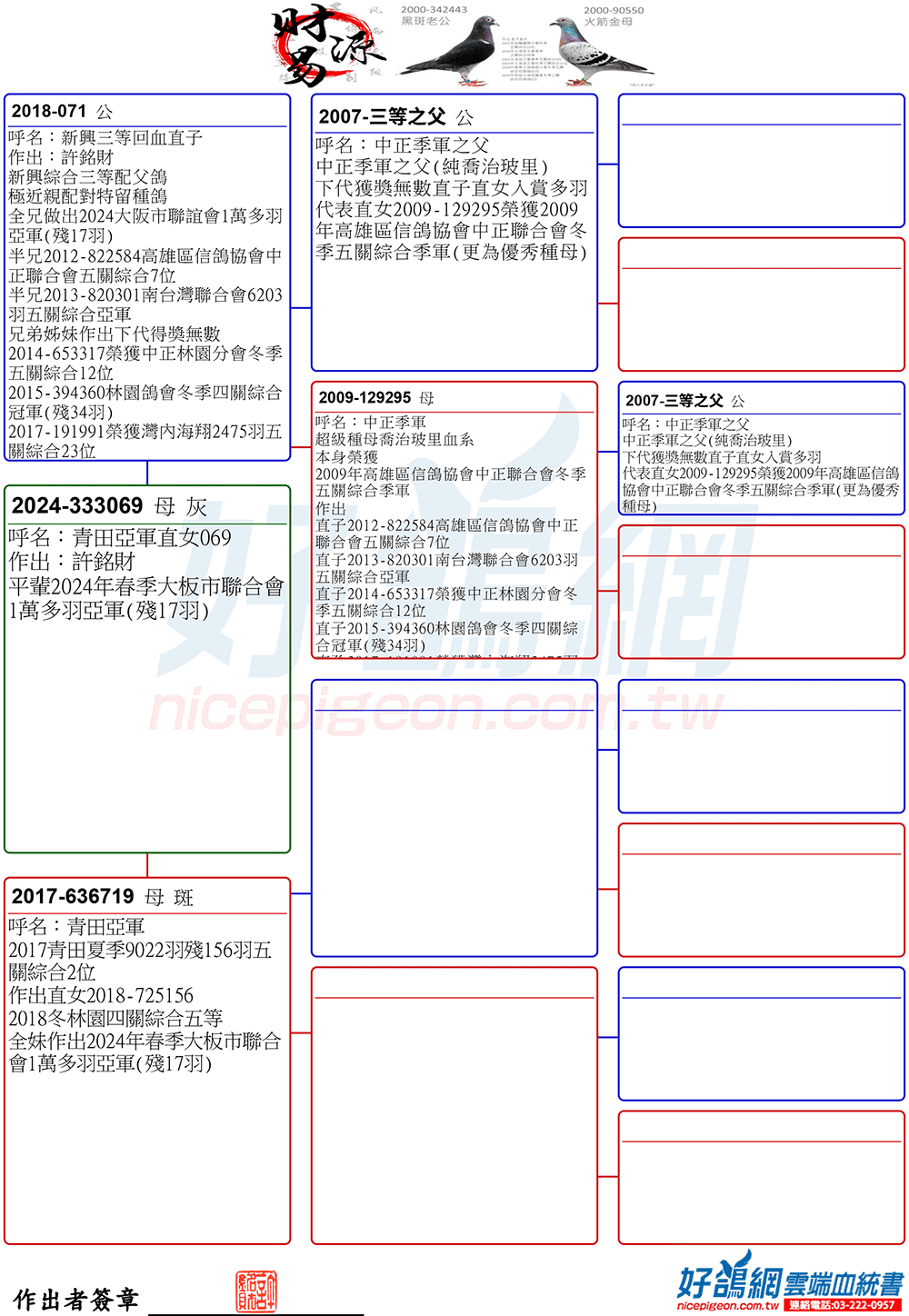 2025年夏季宜蘭聯合會二關綜合8位,環號25-137047灰♂,其父鴿24-993616斑♂,本身入賞夏季三關綜合7位(群益冠軍家族X小火箭三冠家族),母親24-333022,血統為夏季三關綜合亞軍全妹(雙伯馬家族X哈利近親)所作出,許銘財又一次以實戰成績印證了優質血統一脈相承的可貴。