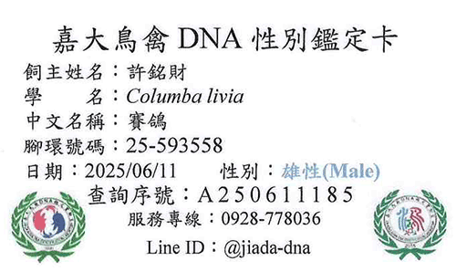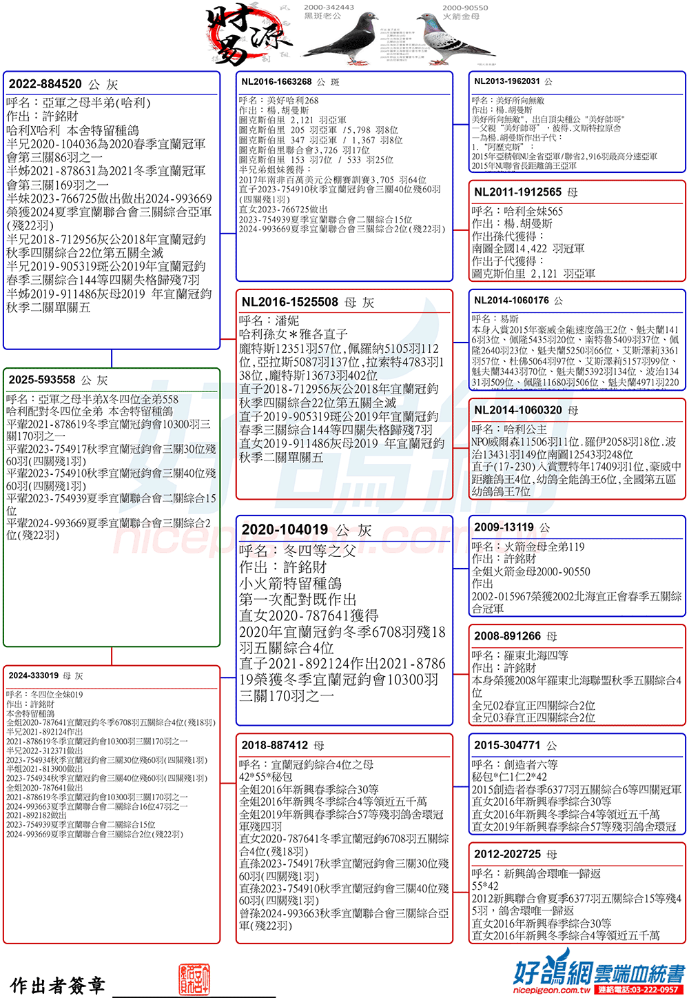 2025年夏季宜蘭聯合會二關綜合8位,環號25-137047灰♂,其父鴿24-993616斑♂,本身入賞夏季三關綜合7位(群益冠軍家族X小火箭三冠家族),母親24-333022,血統為夏季三關綜合亞軍全妹(雙伯馬家族X哈利近親)所作出,許銘財又一次以實戰成績印證了優質血統一脈相承的可貴。
