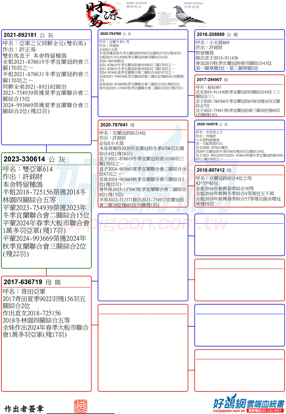 2025年夏季宜蘭聯合會二關綜合8位,環號25-137047灰♂,其父鴿24-993616斑♂,本身入賞夏季三關綜合7位(群益冠軍家族X小火箭三冠家族),母親24-333022,血統為夏季三關綜合亞軍全妹(雙伯馬家族X哈利近親)所作出,許銘財又一次以實戰成績印證了優質血統一脈相承的可貴。