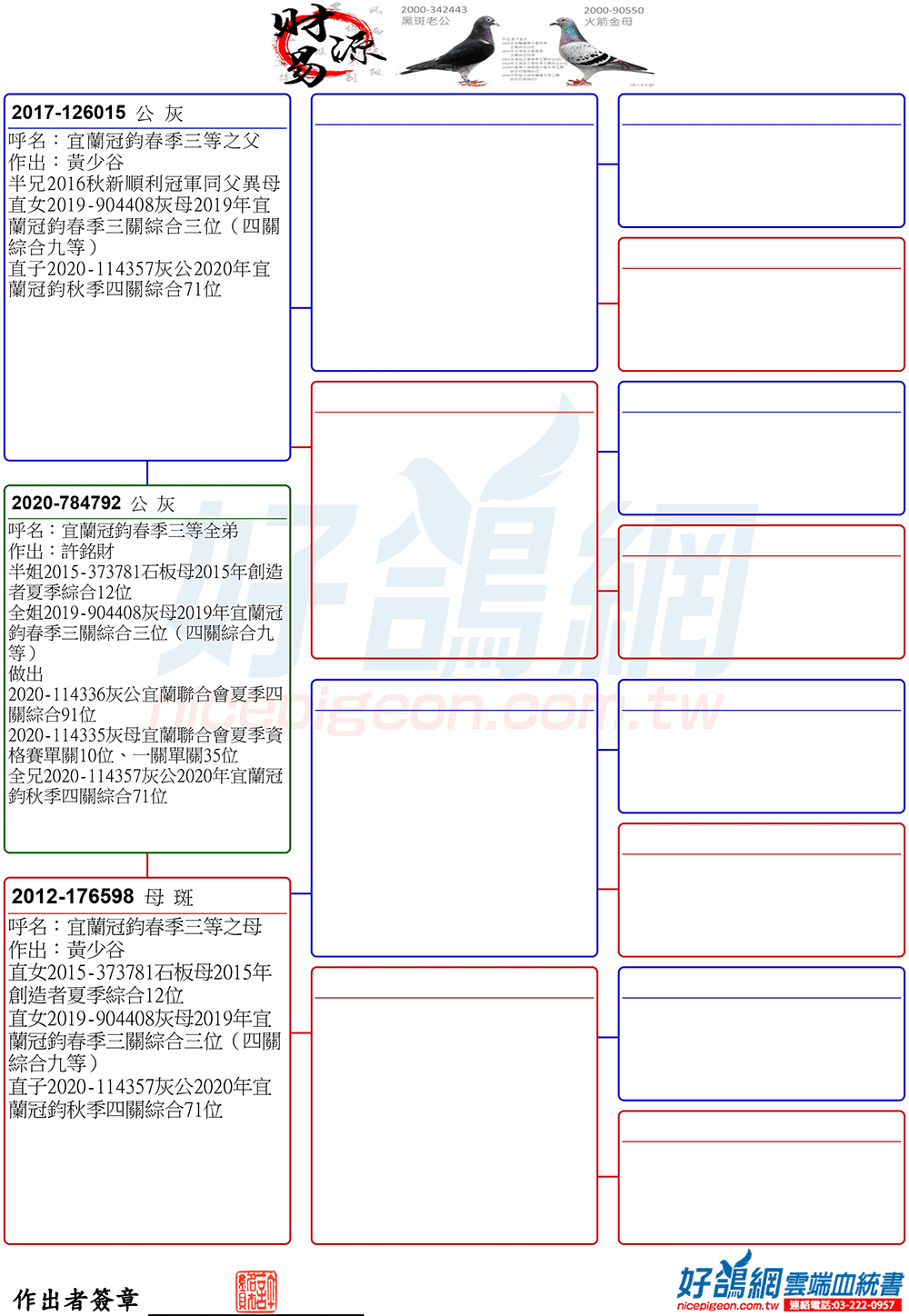 2025年夏季宜蘭聯合會二關綜合8位,環號25-137047灰♂,其父鴿24-993616斑♂,本身入賞夏季三關綜合7位(群益冠軍家族X小火箭三冠家族),母親24-333022,血統為夏季三關綜合亞軍全妹(雙伯馬家族X哈利近親)所作出,許銘財又一次以實戰成績印證了優質血統一脈相承的可貴。