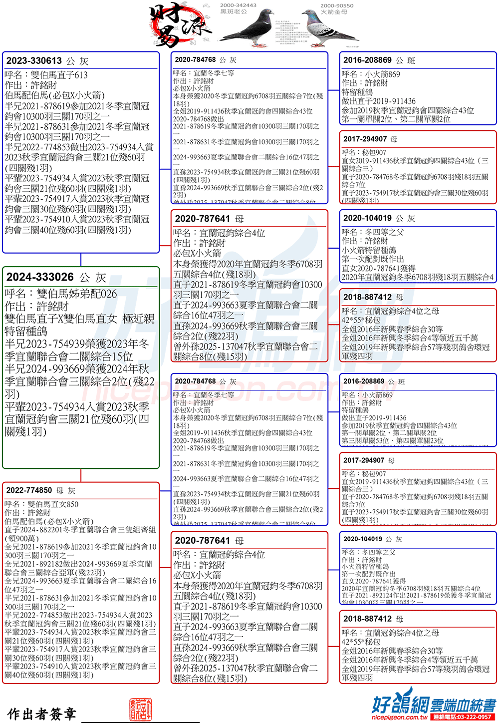 2025年夏季宜蘭聯合會二關綜合8位,環號25-137047灰♂,其父鴿24-993616斑♂,本身入賞夏季三關綜合7位(群益冠軍家族X小火箭三冠家族),母親24-333022,血統為夏季三關綜合亞軍全妹(雙伯馬家族X哈利近親)所作出,許銘財又一次以實戰成績印證了優質血統一脈相承的可貴。