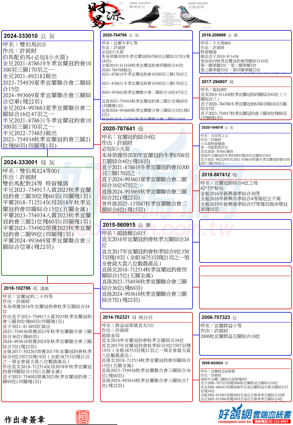 2025年夏季宜蘭聯合會二關綜合8位,環號25-137047灰♂,其父鴿24-993616斑♂,本身入賞夏季三關綜合7位(群益冠軍家族X小火箭三冠家族),母親24-333022,血統為夏季三關綜合亞軍全妹(雙伯馬家族X哈利近親)所作出,許銘財又一次以實戰成績印證了優質血統一脈相承的可貴。