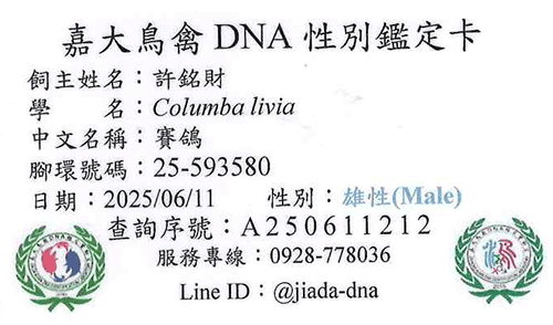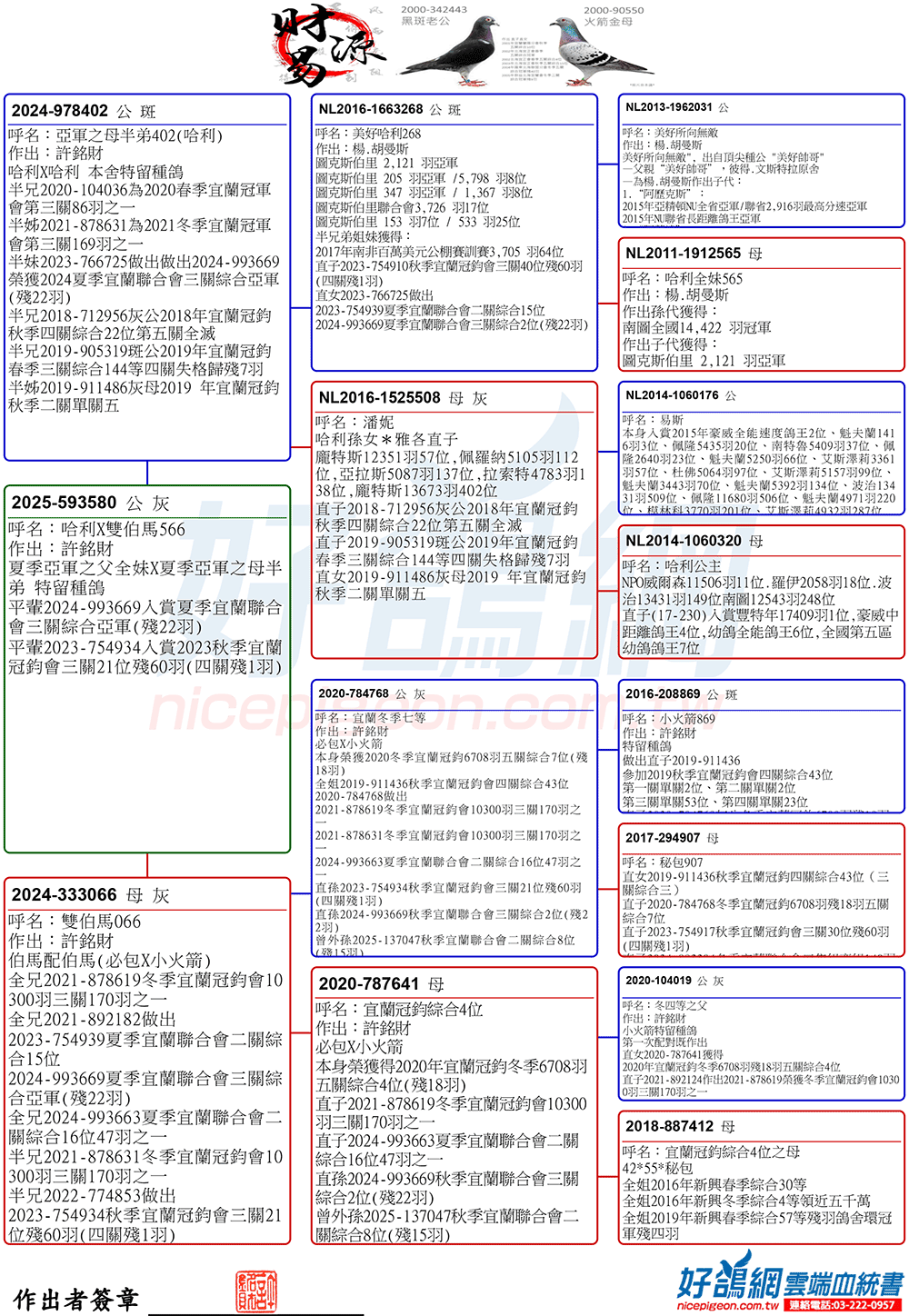 2025年夏季宜蘭聯合會二關綜合8位,環號25-137047灰♂,其父鴿24-993616斑♂,本身入賞夏季三關綜合7位(群益冠軍家族X小火箭三冠家族),母親24-333022,血統為夏季三關綜合亞軍全妹(雙伯馬家族X哈利近親)所作出,許銘財又一次以實戰成績印證了優質血統一脈相承的可貴。