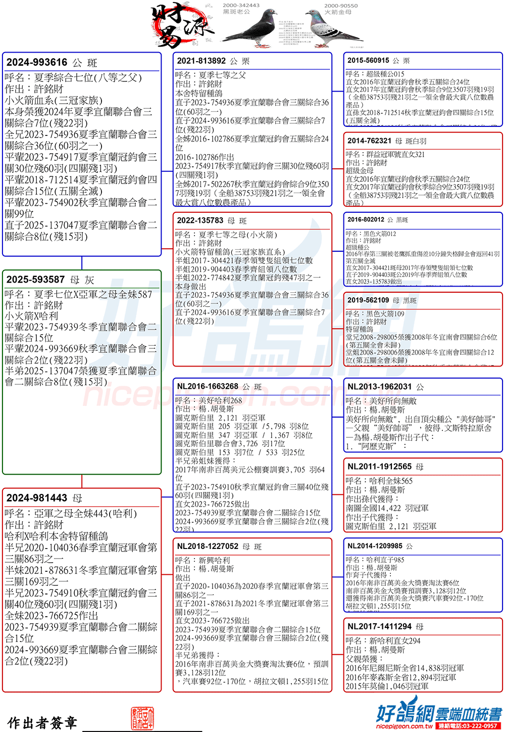 2025年夏季宜蘭聯合會二關綜合8位,環號25-137047灰♂,其父鴿24-993616斑♂,本身入賞夏季三關綜合7位(群益冠軍家族X小火箭三冠家族),母親24-333022,血統為夏季三關綜合亞軍全妹(雙伯馬家族X哈利近親)所作出,許銘財又一次以實戰成績印證了優質血統一脈相承的可貴。