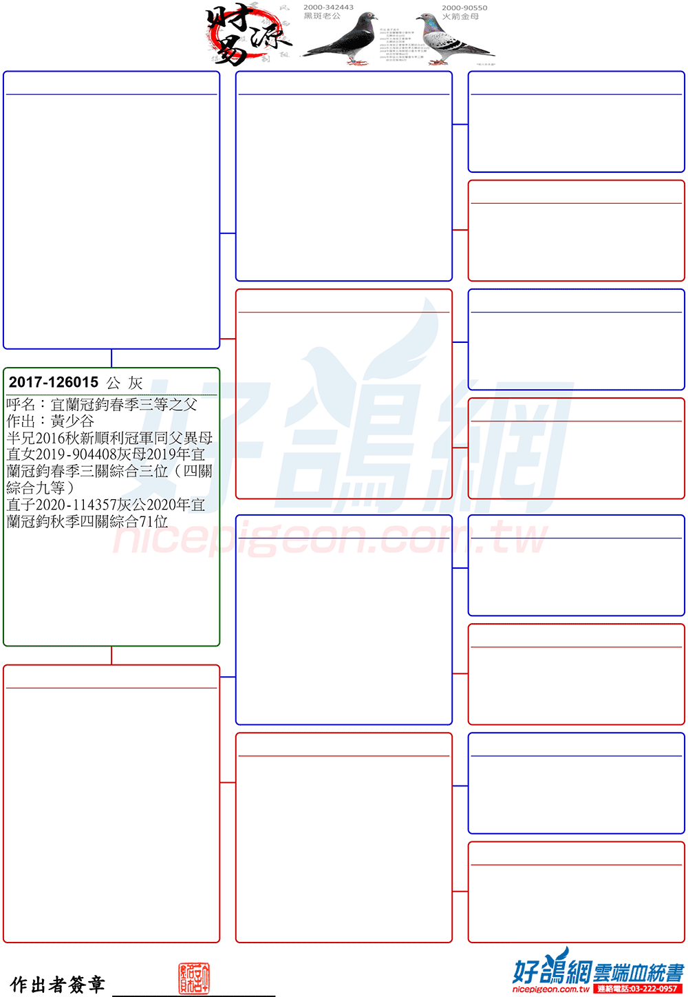 【重要種公】2016年秋新順利冠軍弟鴿;直女2019年宜蘭冠鈞春季三關綜合3位(四關綜合9等)、直子2020年宜蘭秋季四關綜合71位