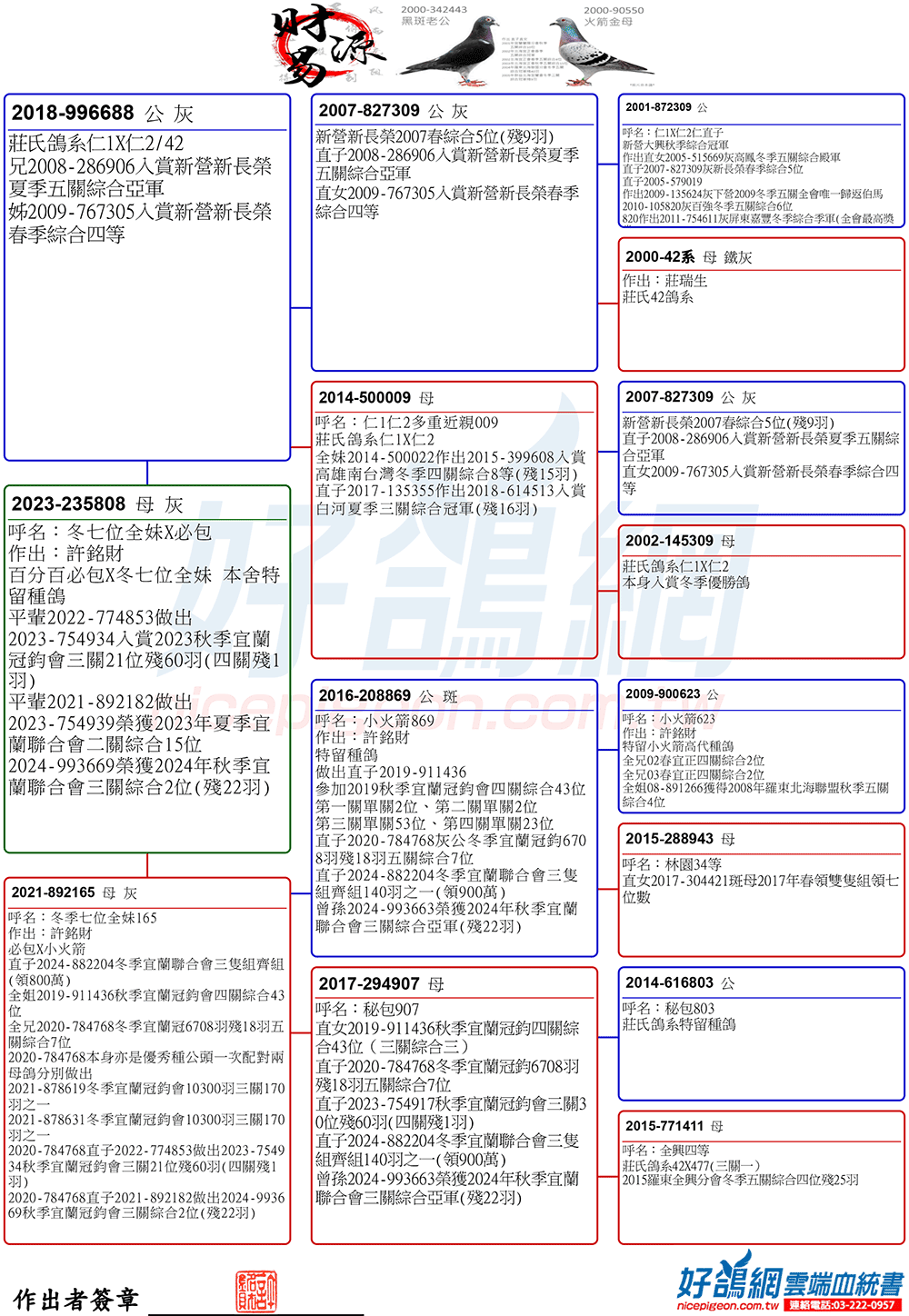2025年夏季宜蘭聯合會二關綜合8位,環號25-137047灰♂,其父鴿24-993616斑♂,本身入賞夏季三關綜合7位(群益冠軍家族X小火箭三冠家族),母親24-333022,血統為夏季三關綜合亞軍全妹(雙伯馬家族X哈利近親)所作出,許銘財又一次以實戰成績印證了優質血統一脈相承的可貴。