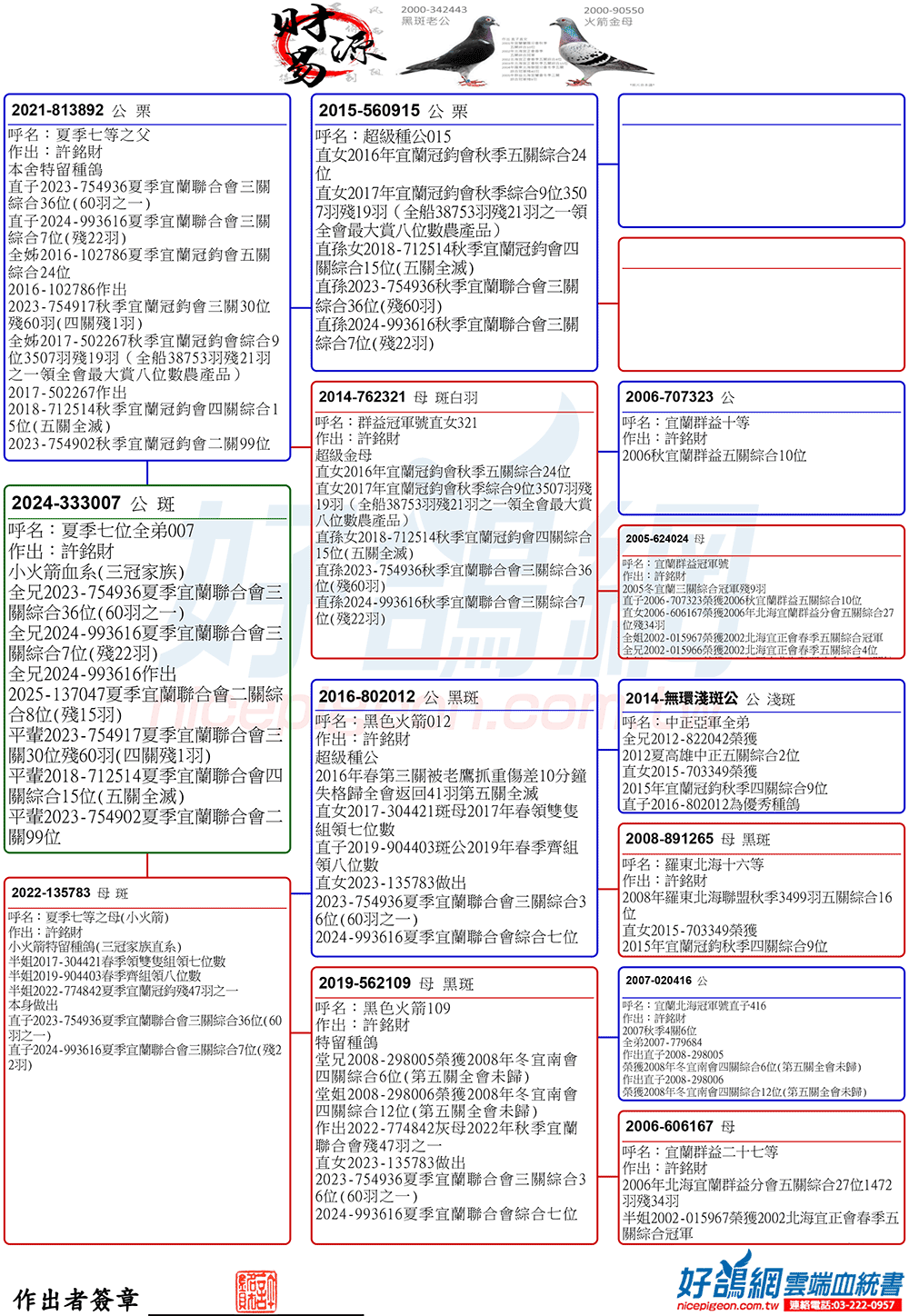 2025年夏季宜蘭聯合會二關綜合8位,環號25-137047灰♂,其父鴿24-993616斑♂,本身入賞夏季三關綜合7位(群益冠軍家族X小火箭三冠家族),母親24-333022,血統為夏季三關綜合亞軍全妹(雙伯馬家族X哈利近親)所作出,許銘財又一次以實戰成績印證了優質血統一脈相承的可貴。