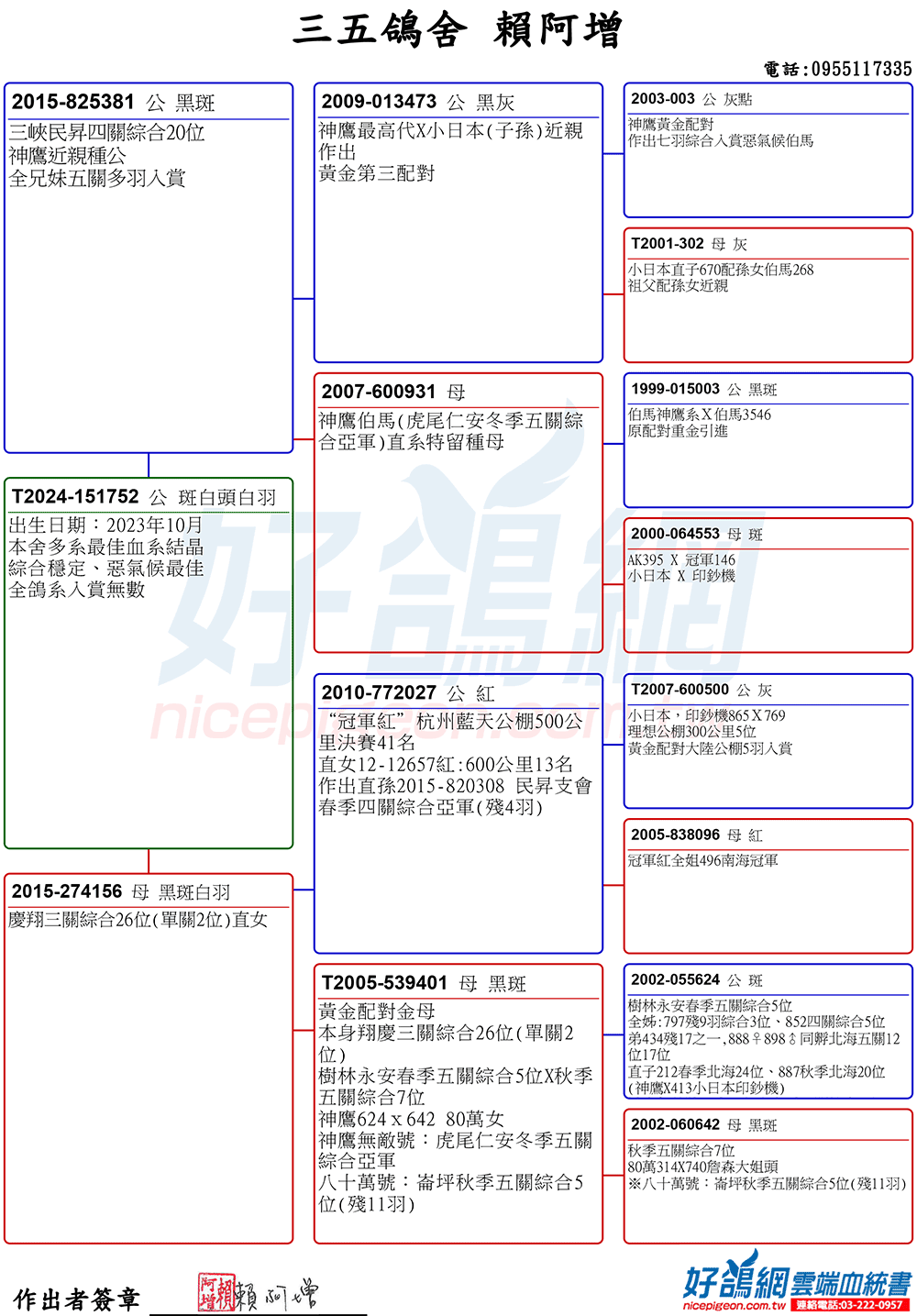 (2)超級種母T83-29914 斑♀"印鈔機",本身入賞72年冬季四關綜合亞軍,印鈔機總共與7羽公鴿配對,每羽的配對直子都得到冠軍,其直系下代翔完五關也超過百羽以上。