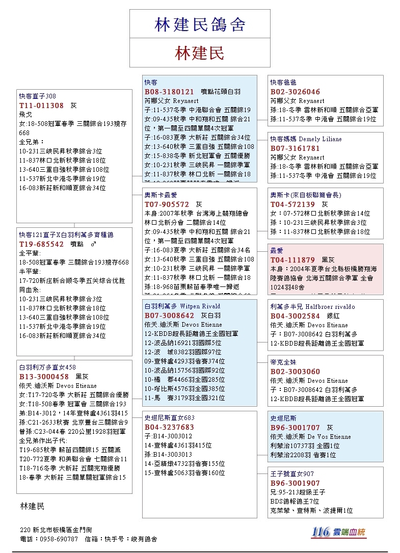 以“快客B08-3180121花頭白羽♂為核心,其血統出自芮娜父女本舍作出,父鴿046為中距離鴿王冠軍“超級快客”X克莉絲所作出,其直子入賞新和順夏季綜合34位、中港冬季綜合19位、直女入賞三峽民昇秋季綜合3位、林口北新秋季綜合18位,目前已發揮至第五代,快客下代在該舍可說是耐力與速度兼具的奪標主力,快客在9歲高齡還作出伯馬子代,其優秀遺傳力可見一斑。