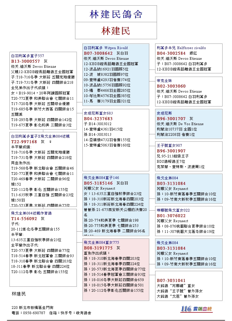 以B07-6235207灰♂為基礎,這位居住在比利時阿連棟克的老將,是一位在幼鴿速度賽的佼佼者,生涯中屢獲比利時KBDB速度鴿王冠軍榮銜的名將,林建民是台灣鴿界最早引進雷尼馬頓鴿系的先驅者之一,此系在燠熱低分速的賽事中常有
