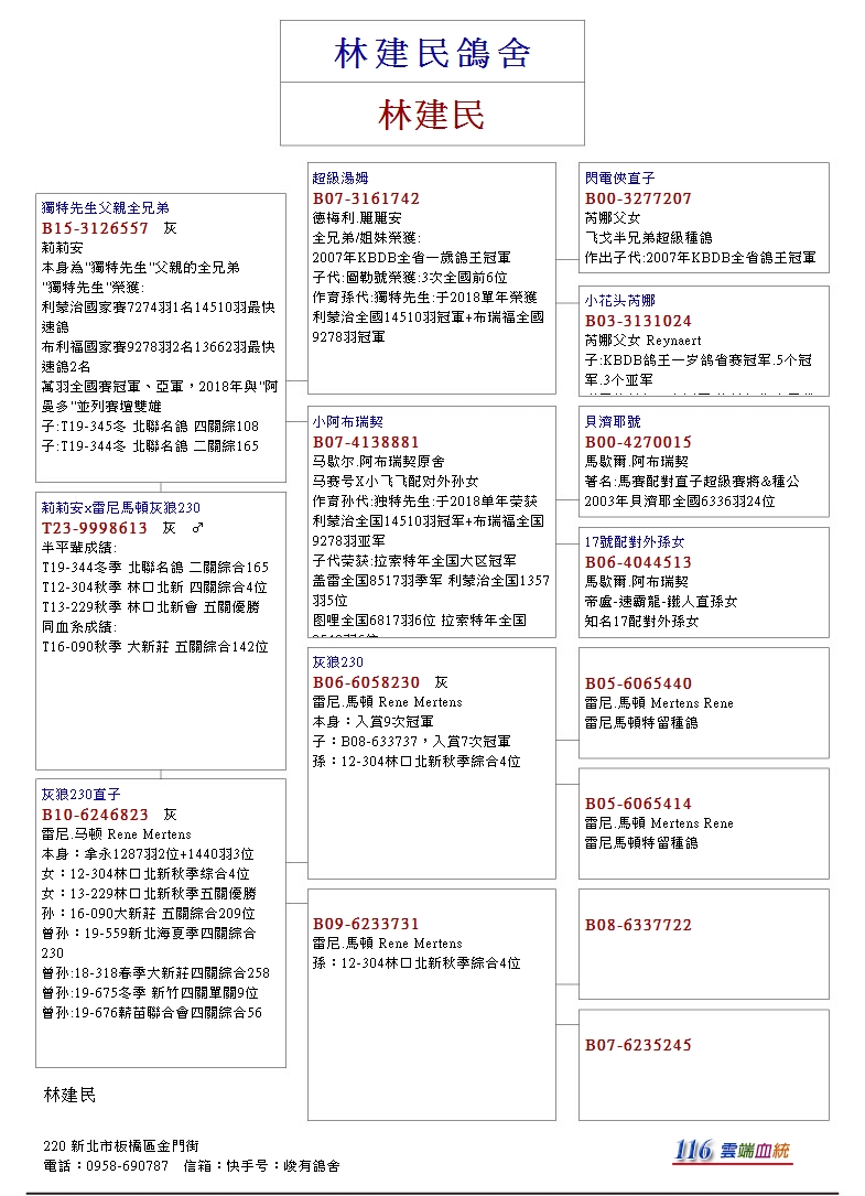 以B07-6235207灰♂為基礎,這位居住在比利時阿連棟克的老將,是一位在幼鴿速度賽的佼佼者,生涯中屢獲比利時KBDB速度鴿王冠軍榮銜的名將,林建民是台灣鴿界最早引進雷尼馬頓鴿系的先驅者之一,此系在燠熱低分速的賽事中常有