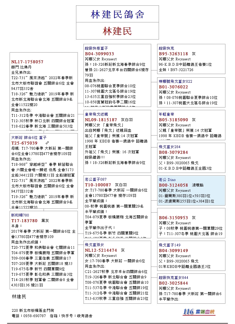 在兩岸競翔圈享有盛名,曾經五度拿下全船總冠軍(二次全會唯一歸返、一次全船唯一歸返),並在大陸指標鴿會北京開創者,勇奪鐵鷹四關綜合冠軍、天津開創者國際俱樂部多次贏得鉅獎的土城林建民鴿舍,因生涯規劃,即將前往大陸發展事業,因而決定將鴿舍4百餘羽種賽鴿,全數分批在好鴿網平台公開拍賣,第一批將於2026年元月份搶先上架,敬請鴿友把握引種良機。