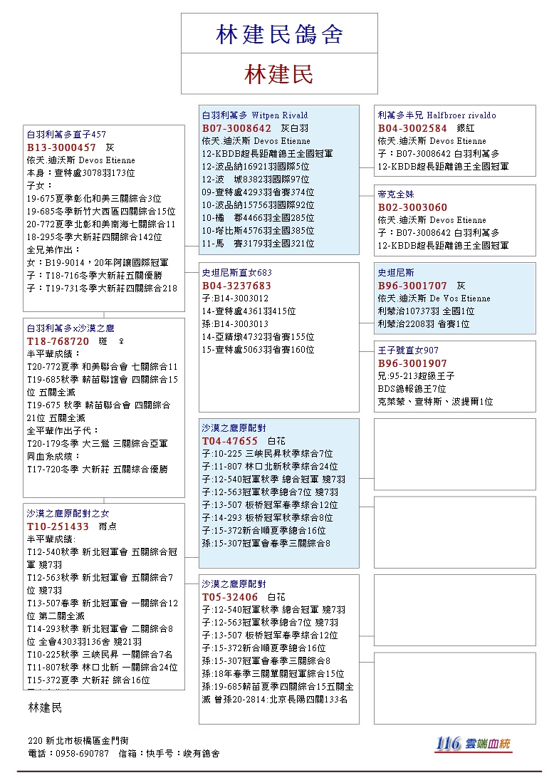 以“快客B08-3180121花頭白羽♂為核心,其血統出自芮娜父女本舍作出,父鴿046為中距離鴿王冠軍“超級快客”X克莉絲所作出,其直子入賞新和順夏季綜合34位、中港冬季綜合19位、直女入賞三峽民昇秋季綜合3位、林口北新秋季綜合18位,目前已發揮至第五代,快客下代在該舍可說是耐力與速度兼具的奪標主力,快客在9歲高齡還作出伯馬子代,其優秀遺傳力可見一斑。