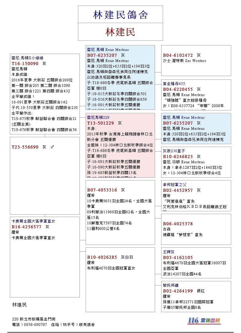 以B07-6235207灰♂為基礎,這位居住在比利時阿連棟克的老將,是一位在幼鴿速度賽的佼佼者,生涯中屢獲比利時KBDB速度鴿王冠軍榮銜的名將,林建民是台灣鴿界最早引進雷尼馬頓鴿系的先驅者之一,此系在燠熱低分速的賽事中常有