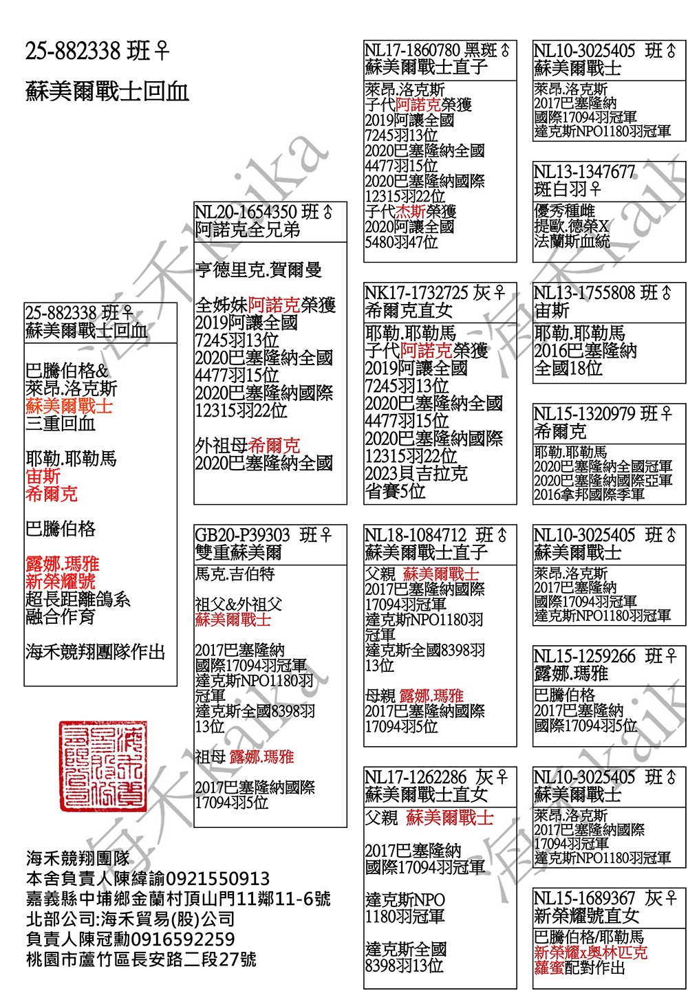 蘇美爾戰士(巴塞隆納國際17094羽冠軍、達克斯NPO1180羽冠軍)三重近親