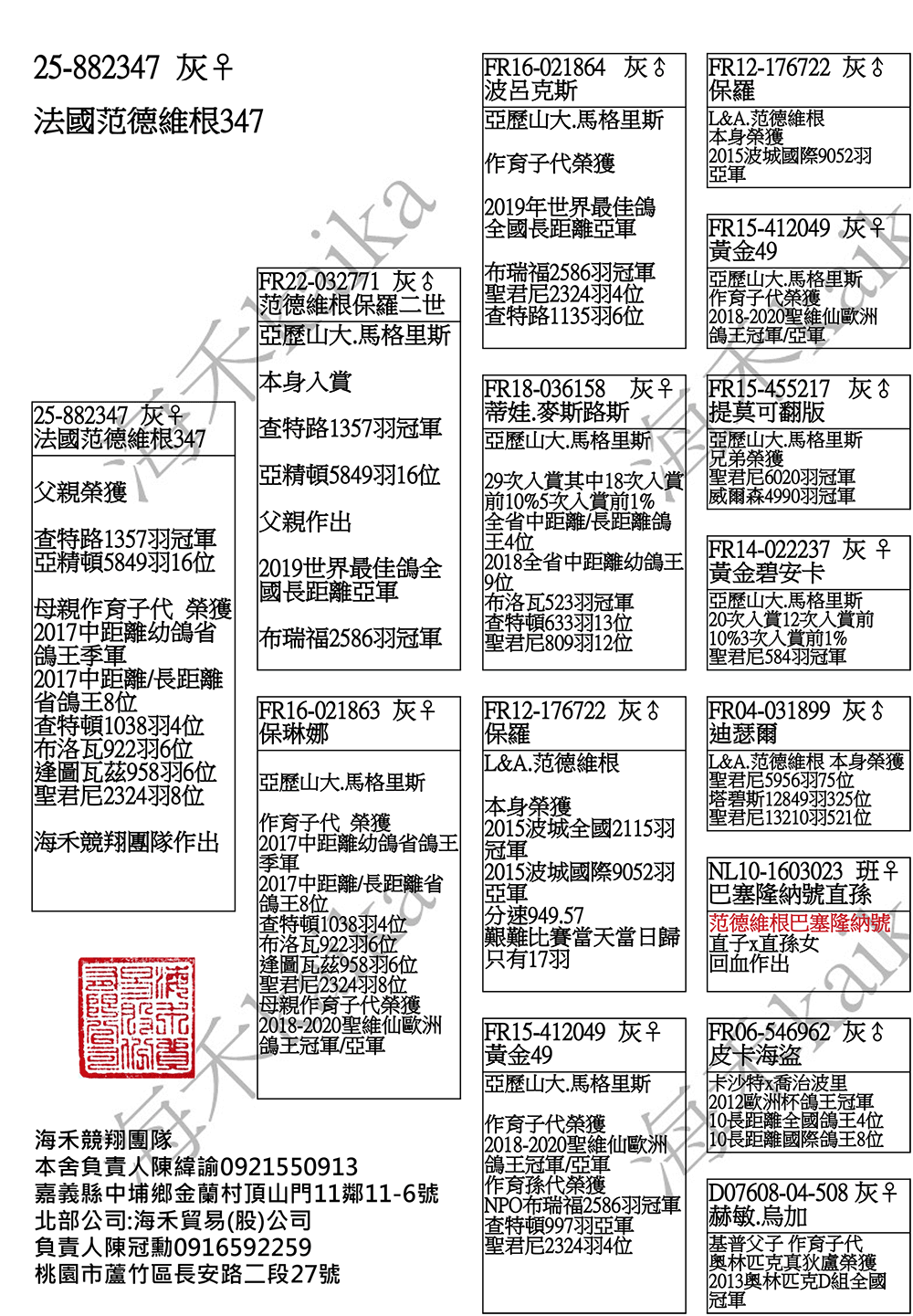 查特路1357羽冠軍(布瑞福2586羽冠軍弟鴿)直女、2017年中距離幼鴿省鴿王季軍妹鴿