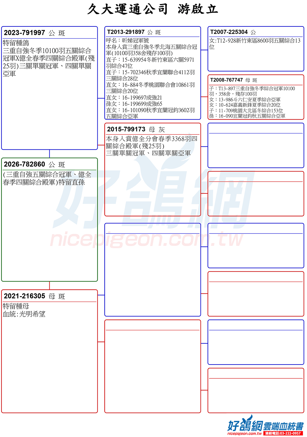 《宜蘭大都會未賽鴿》昕娣冠軍號(三重自強冬季10100羽五關綜合冠軍)多重近親