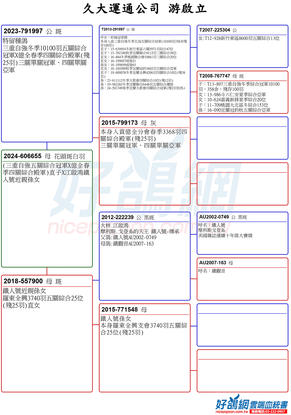《宜蘭大都會未賽鴿》昕娣冠軍號(三重自強冬季10100羽五關綜合冠軍)多重近親