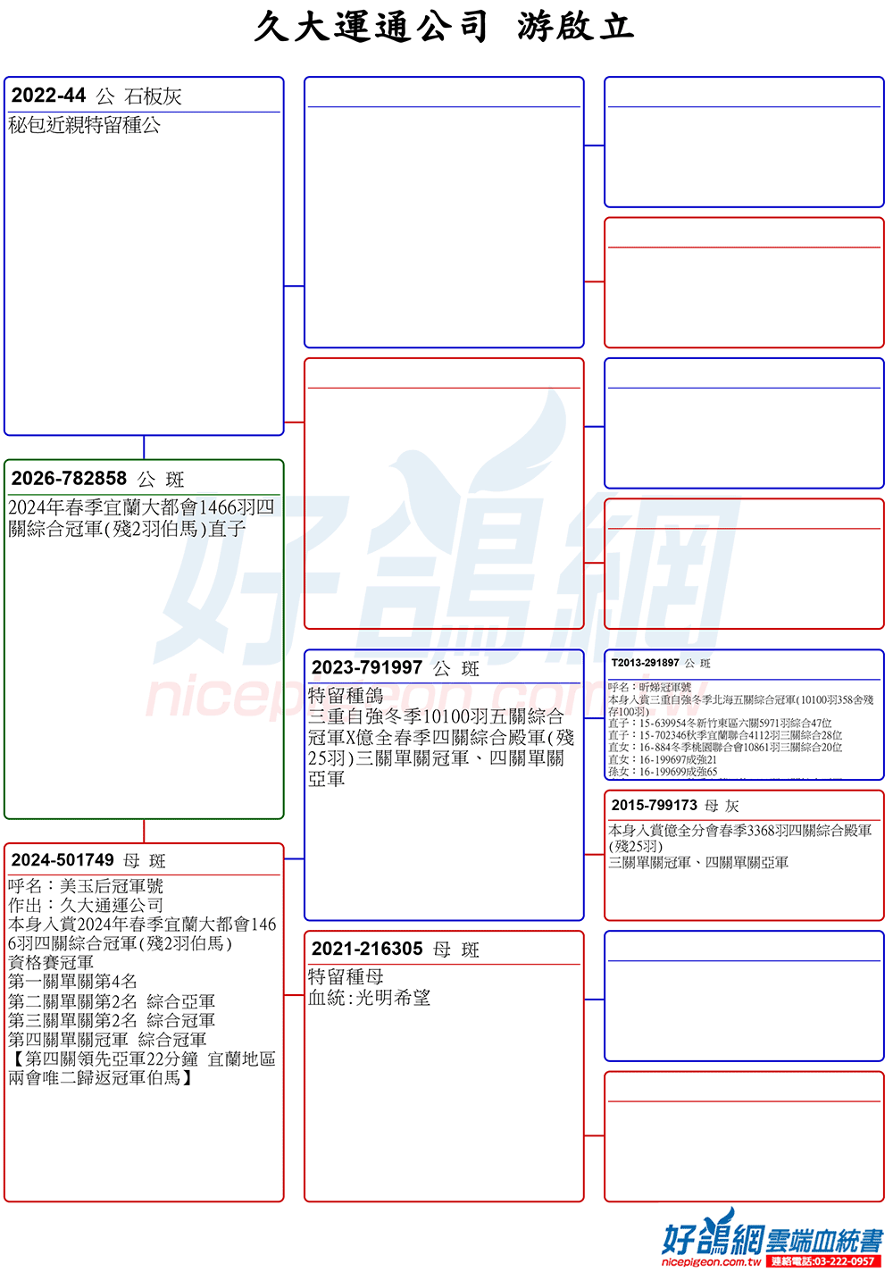 《宜蘭大都會未賽鴿》昕娣冠軍號(三重自強冬季10100羽五關綜合冠軍)多重近親
