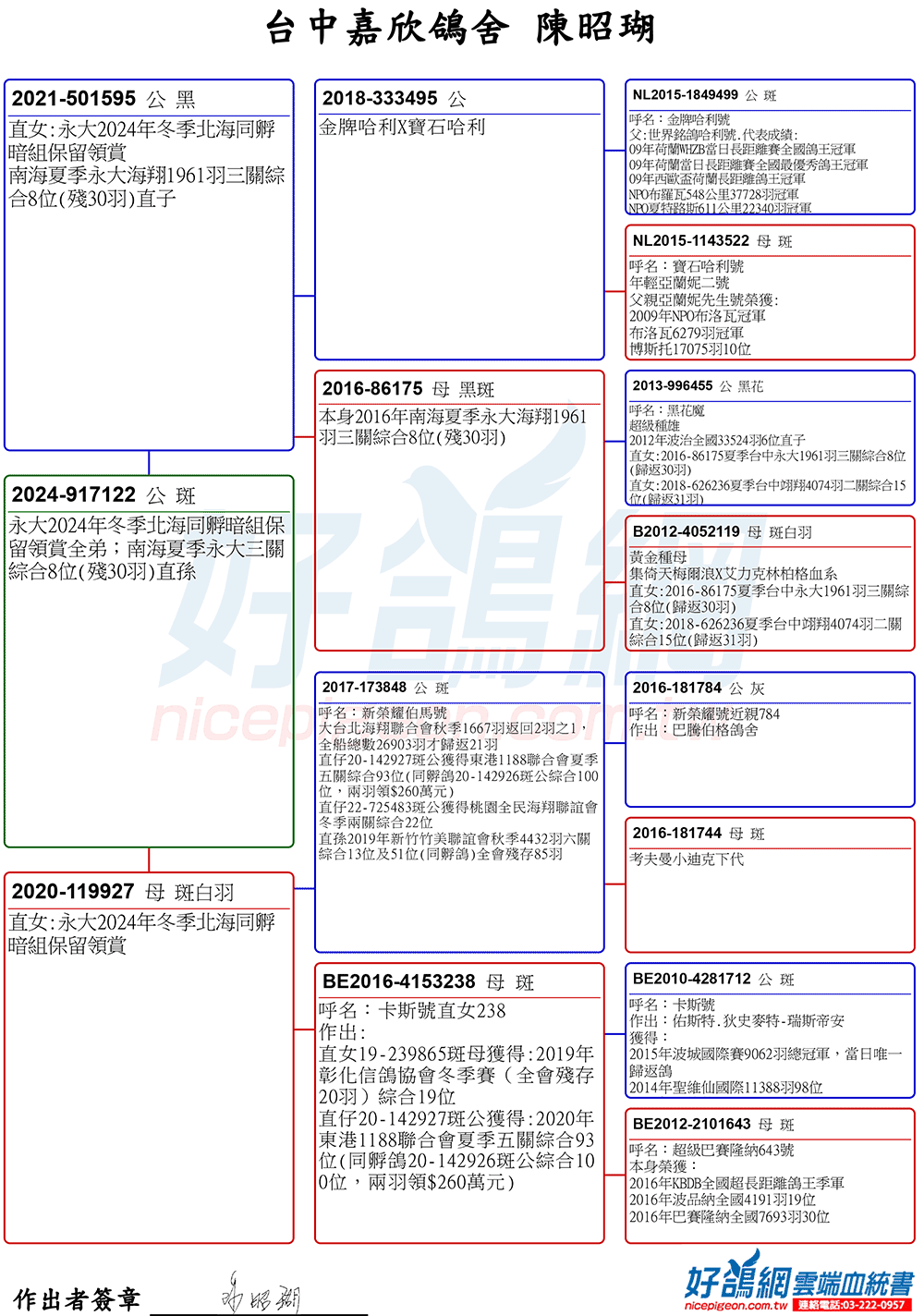 永大2024年冬季北海同孵暗組保留領賞全弟;南海夏季永大三關綜合8位(殘30羽)直孫