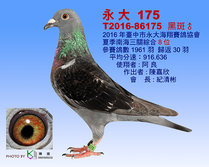 ▲祖母:2016-86175夏季台中永大1961羽三關綜合8位(歸返30羽)