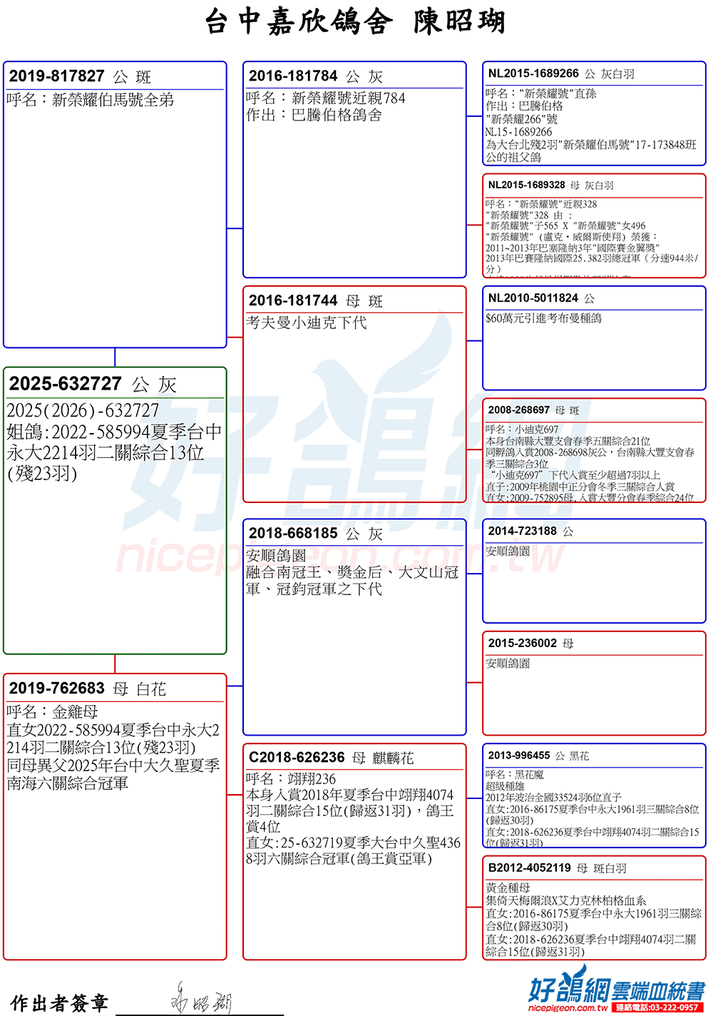 22年夏季台中永大二關綜合13位(殘23羽)弟鴿;2025年台中大久聖夏季南海六關綜合冠軍家族