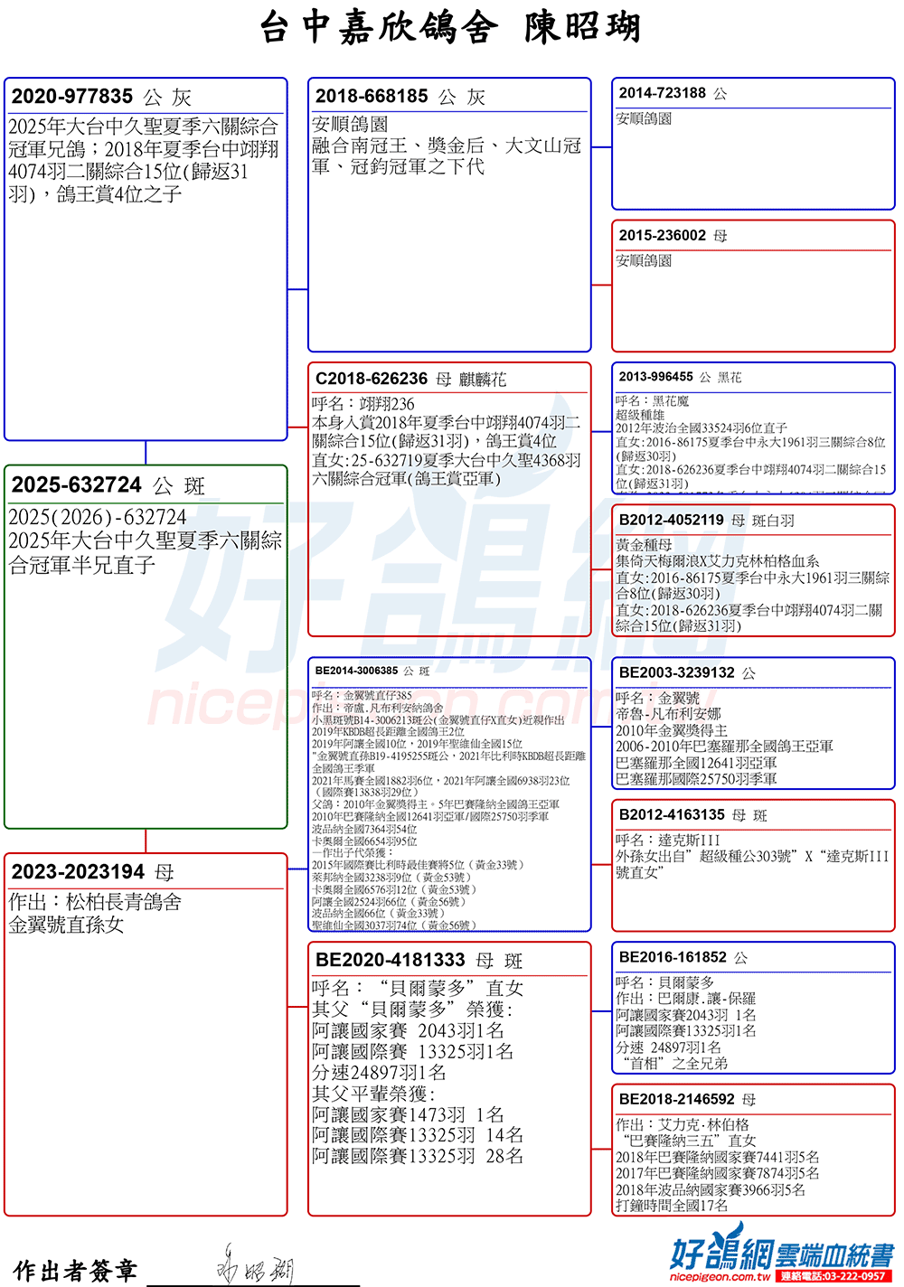 2025年夏季,再於台中久聖4368羽六關賽事中奪得綜合冠軍,並同時摘下鴿王賞亞軍。能在長達多關賽的嚴苛淘汰賽中脫穎而出,代表的不僅是優秀的表現,而是家族鴿系的成熟與穩定。